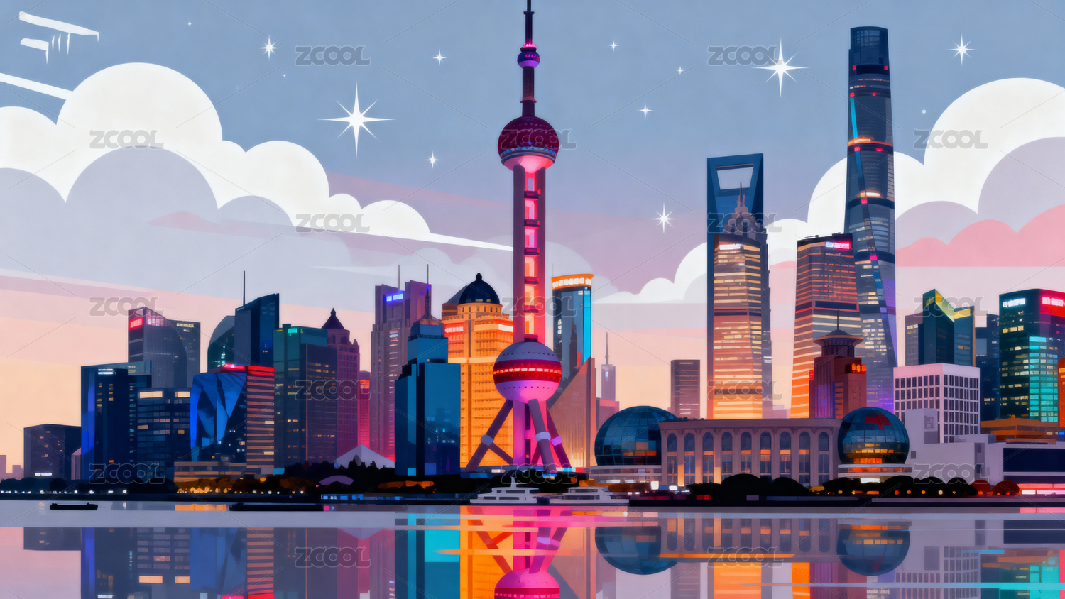 中国上海陆家嘴商务科技城市彩色天际线插画