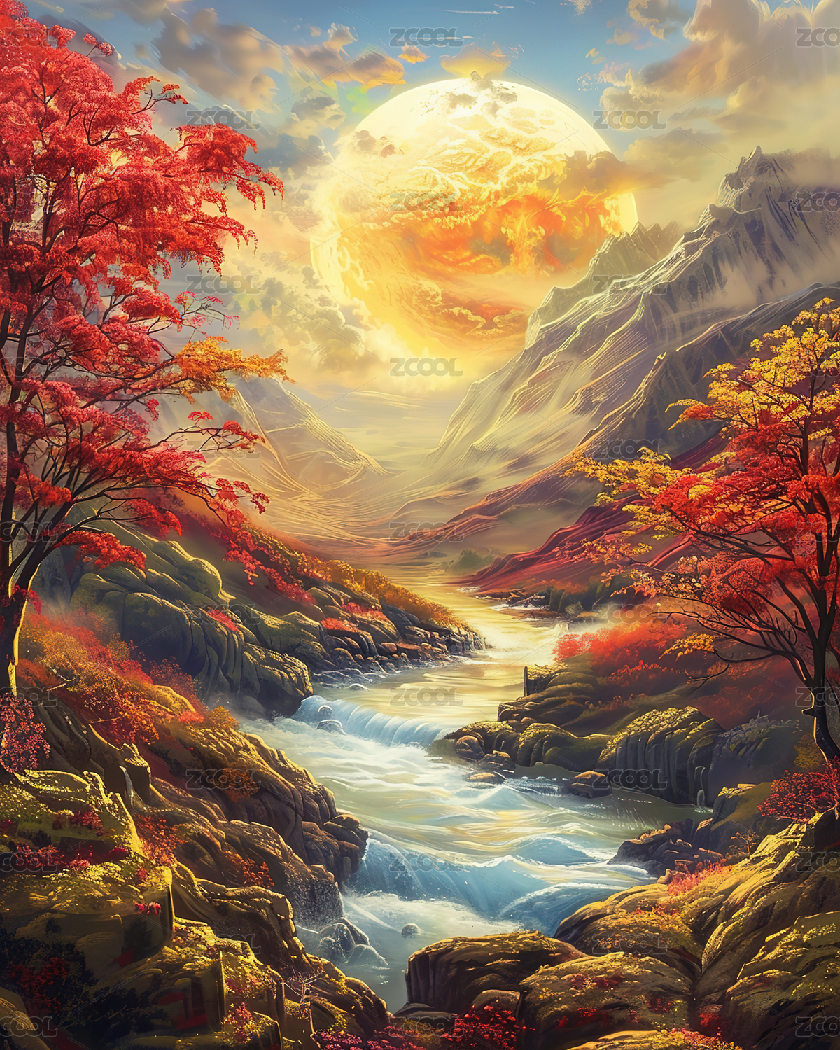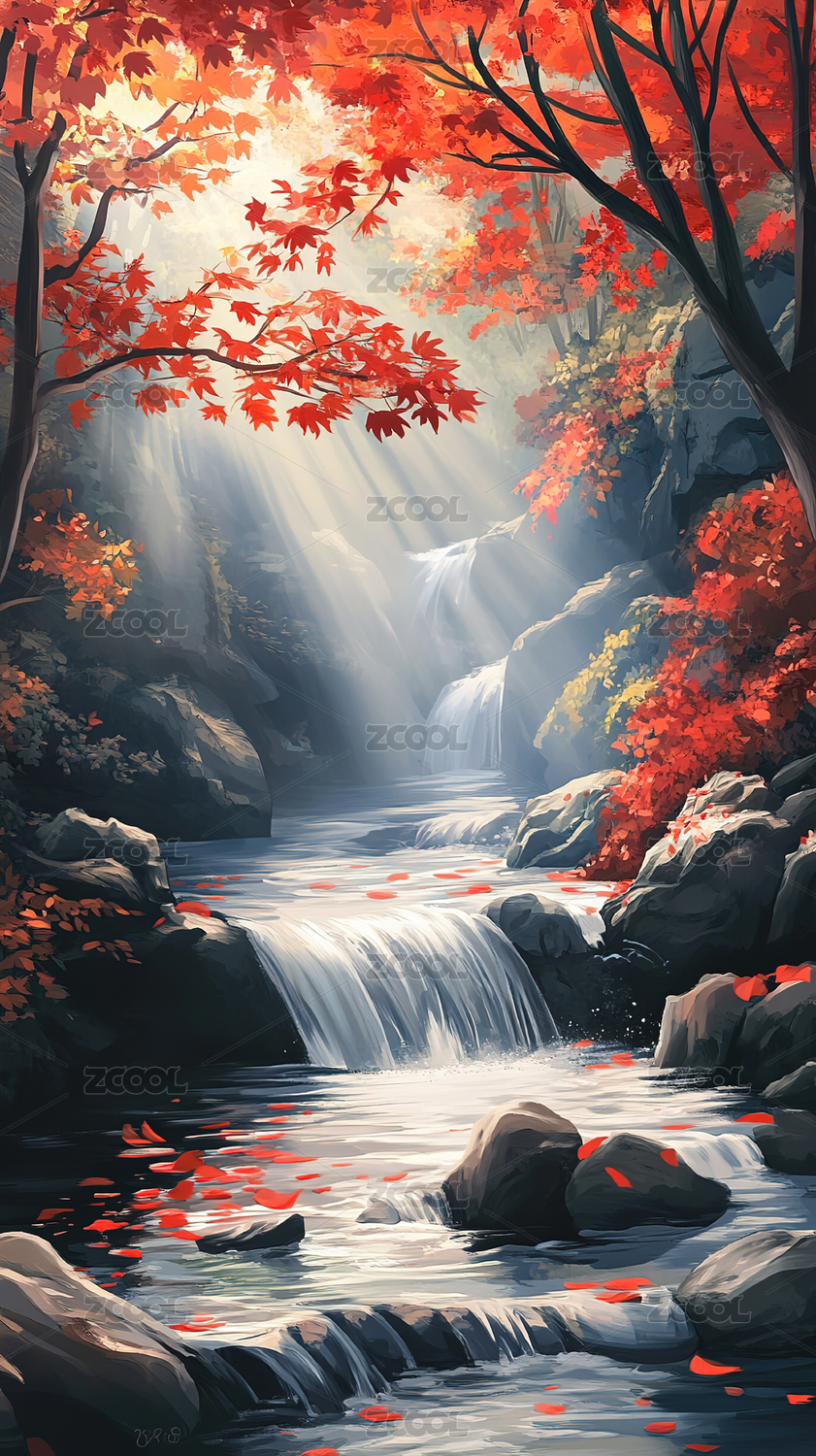 秋天,风景,插画,溪流,瀑布,红叶,树林