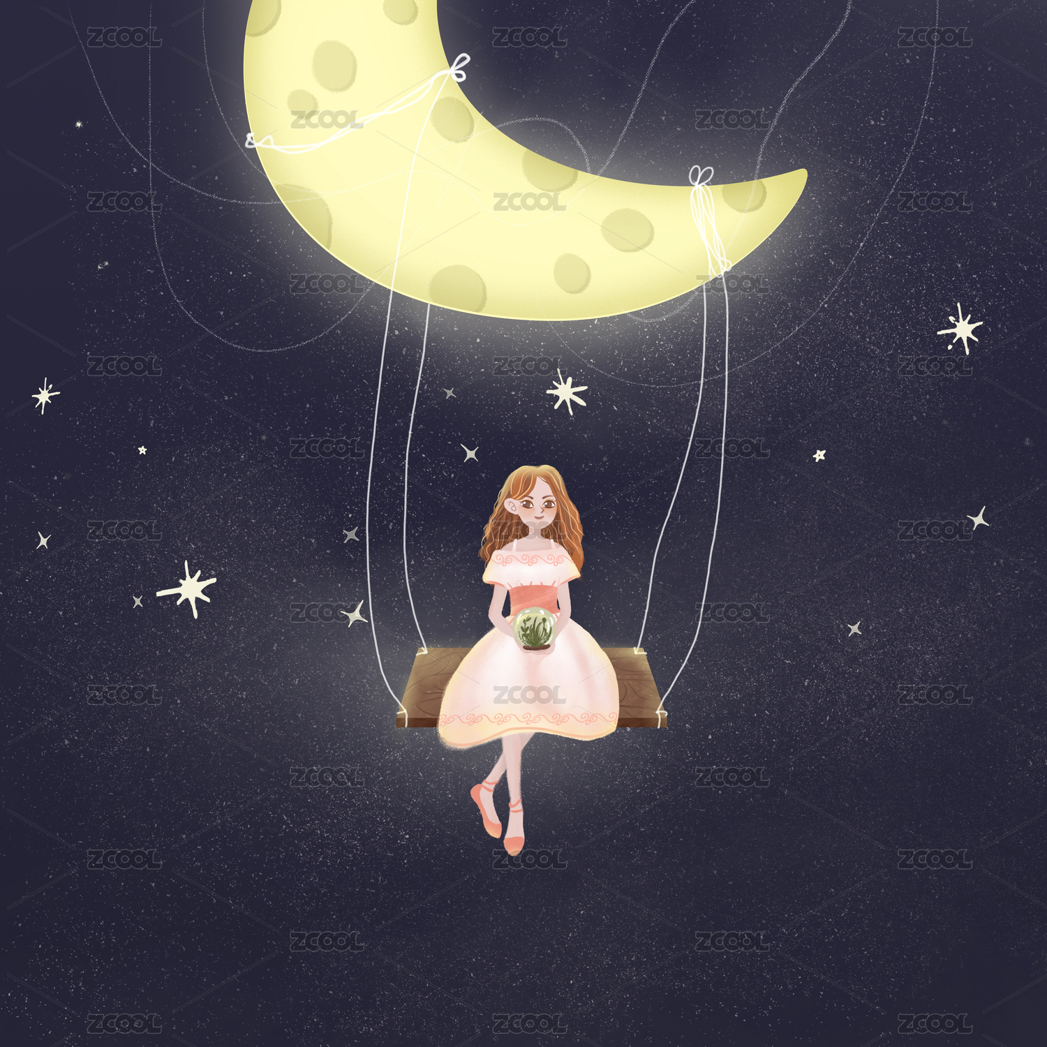 女孩,全身像,女生,可爱,卡通,月亮,竖构图,植物,星星,天空