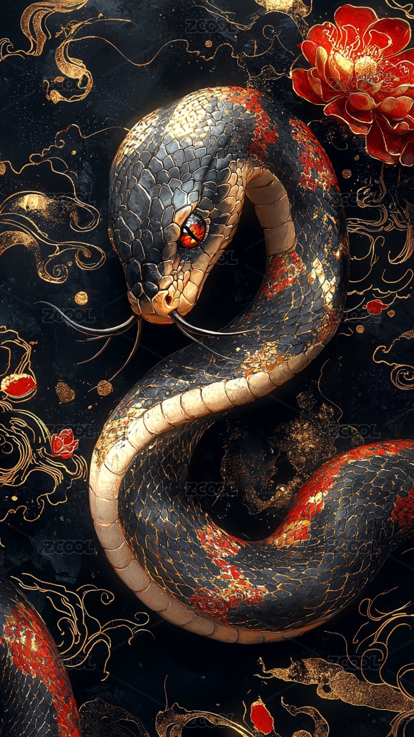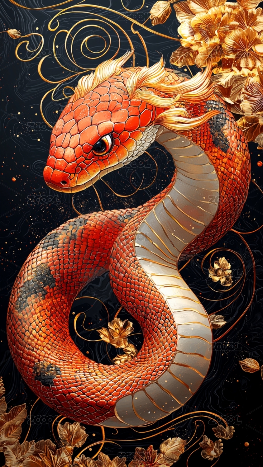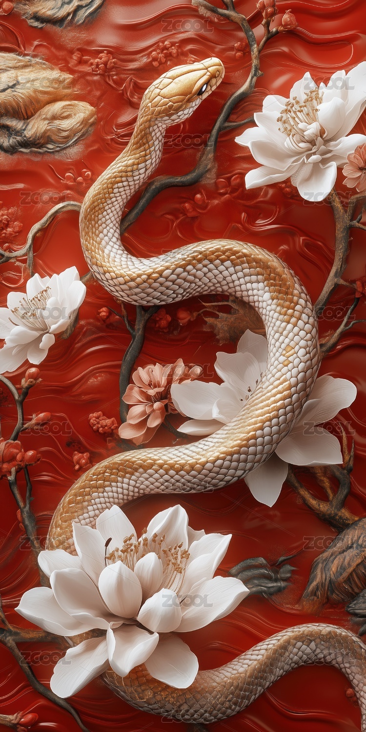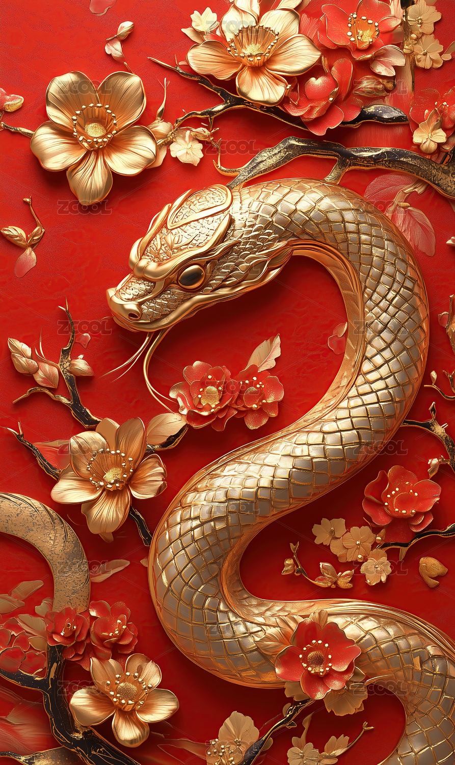 国风喜庆红色背景花丛金色蛇3D立体插画