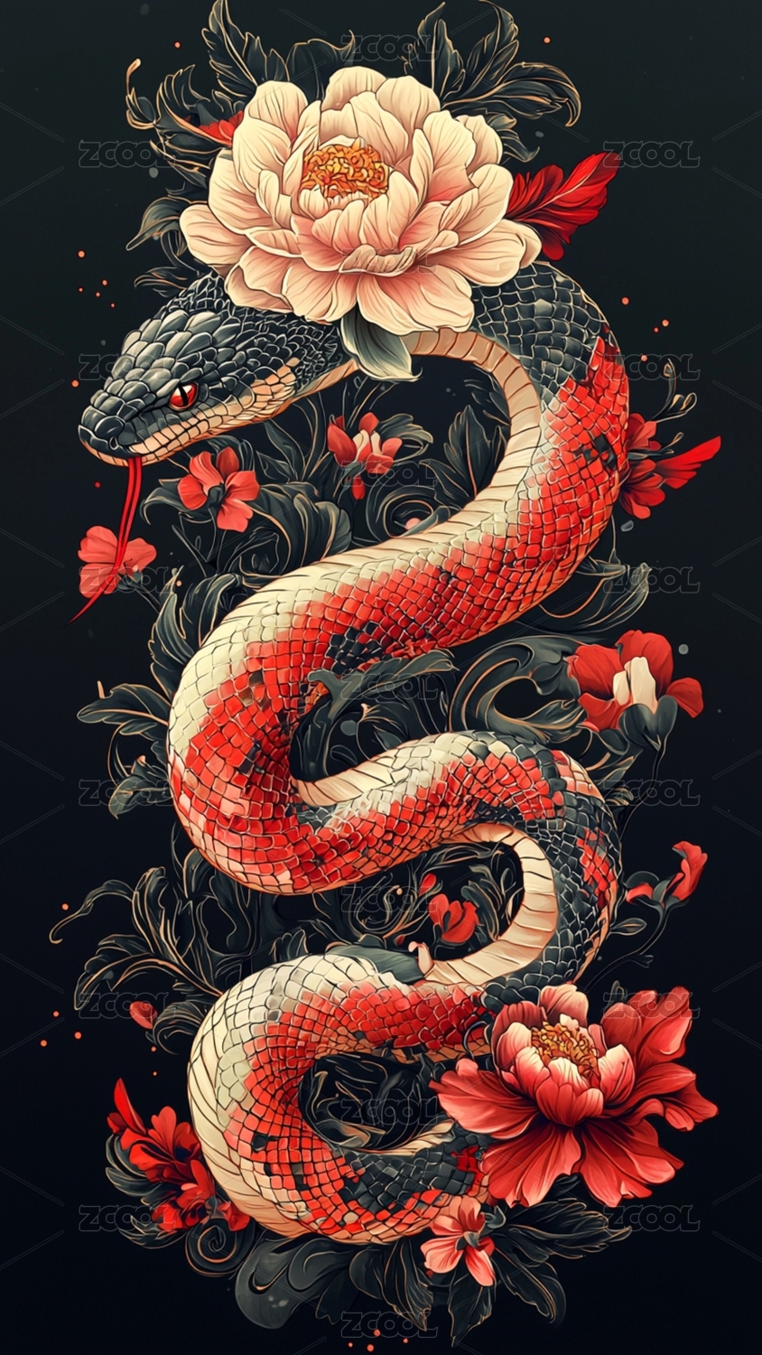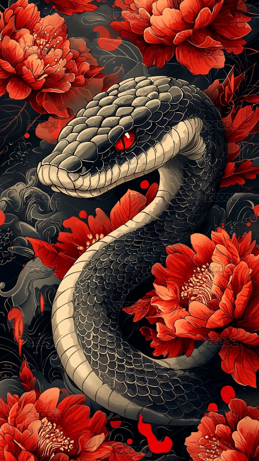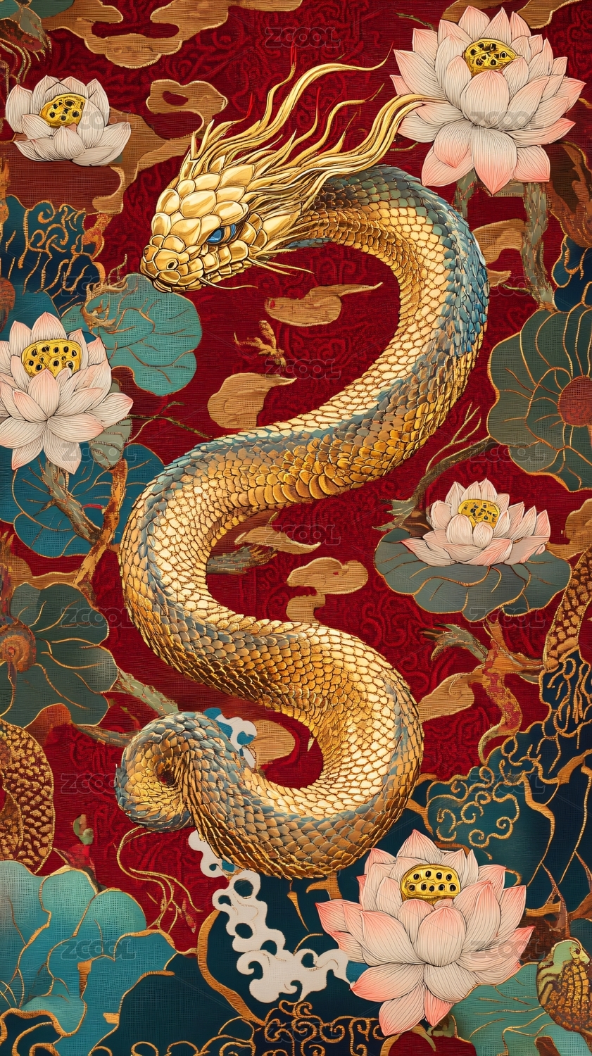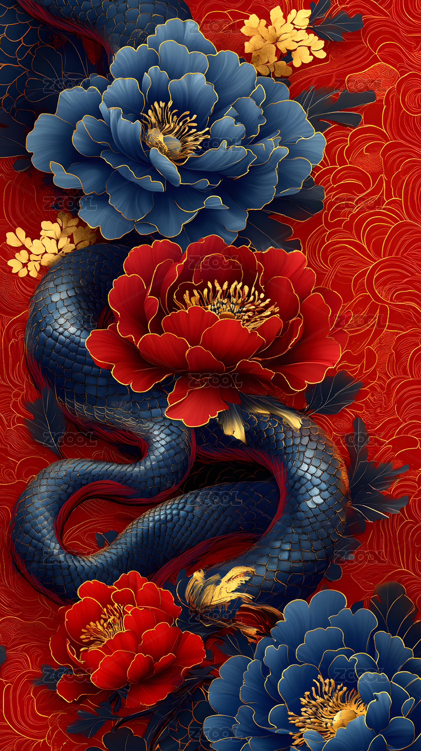 国风喜庆红色背景花丛金色蛇3D立体插画