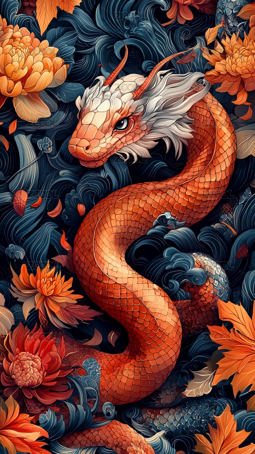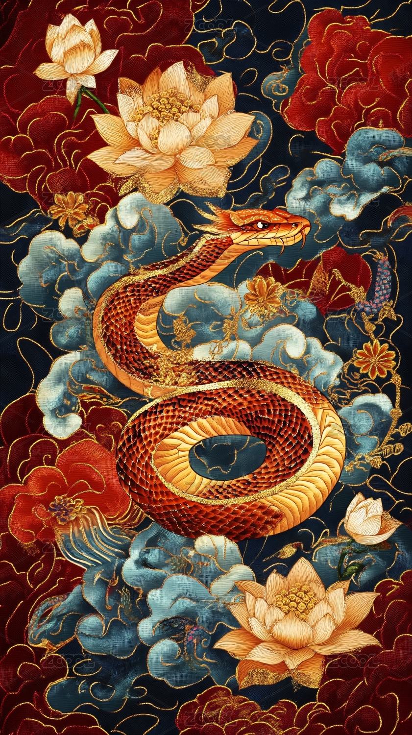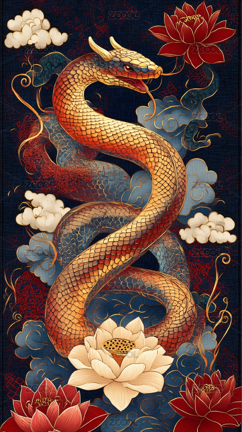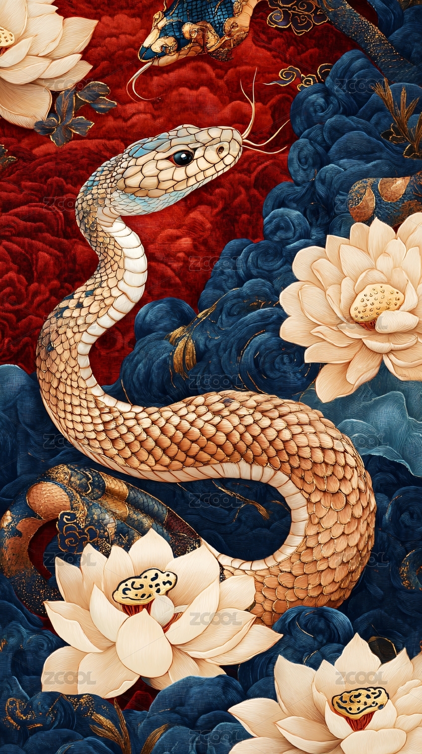 国风喜庆红色背景花丛金色蛇3D立体插画