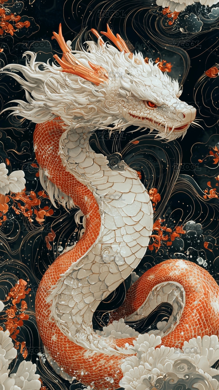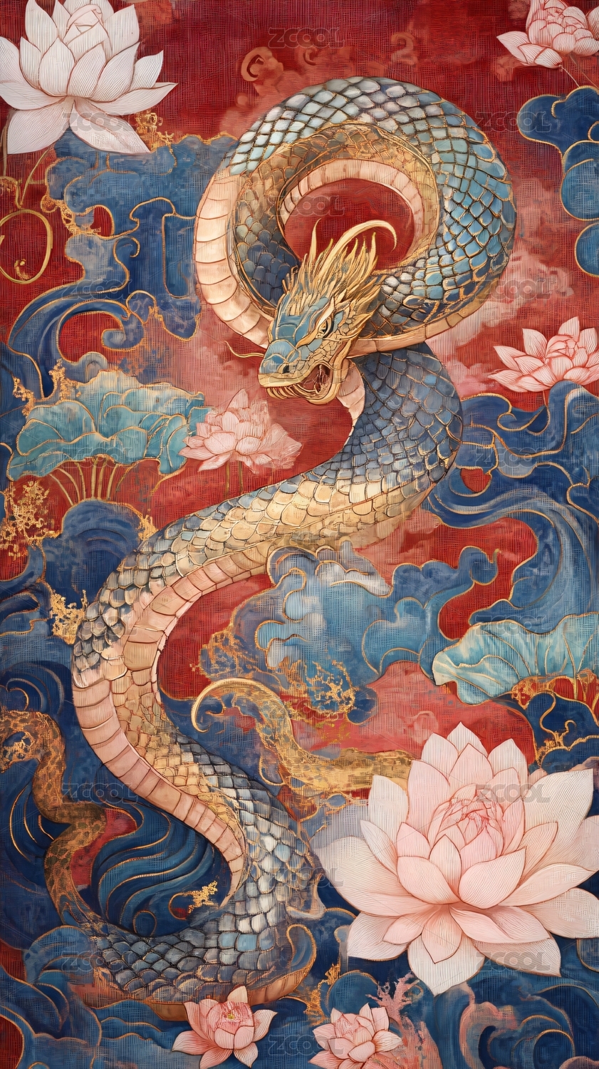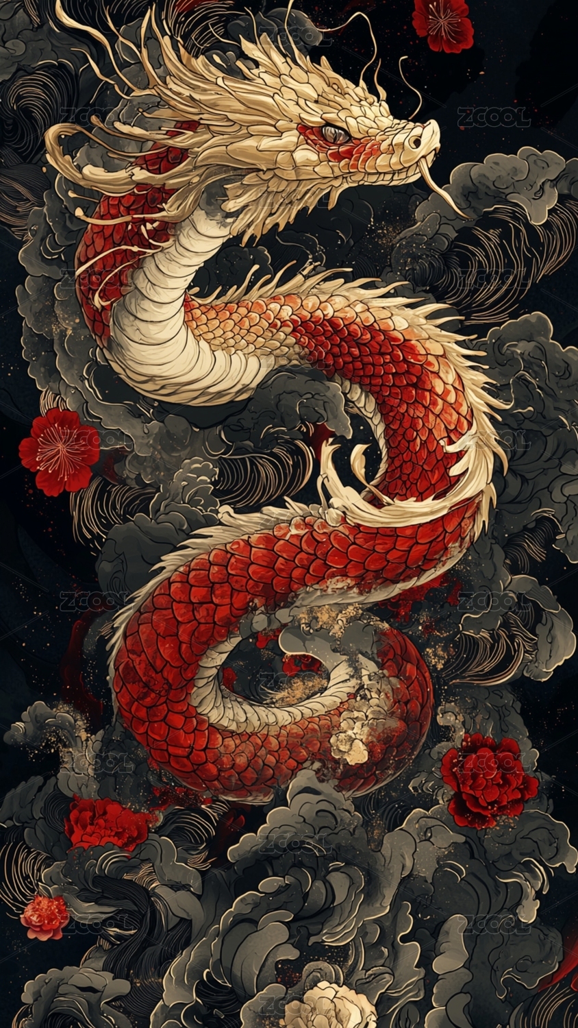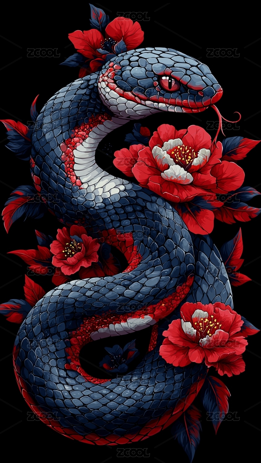 国风喜庆红色背景花丛金色蛇3D立体插画
