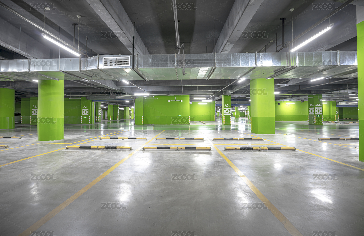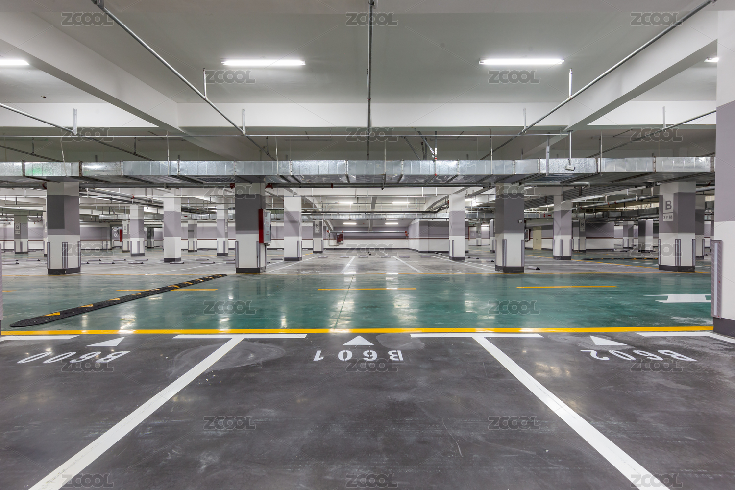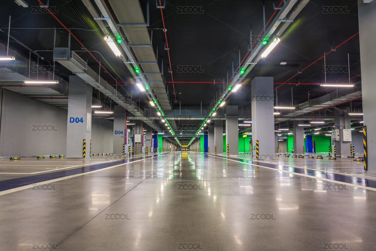 色彩鲜艳宽阔整洁的地下停车场