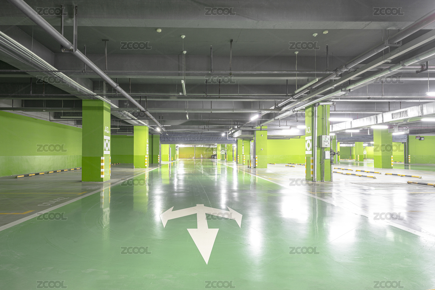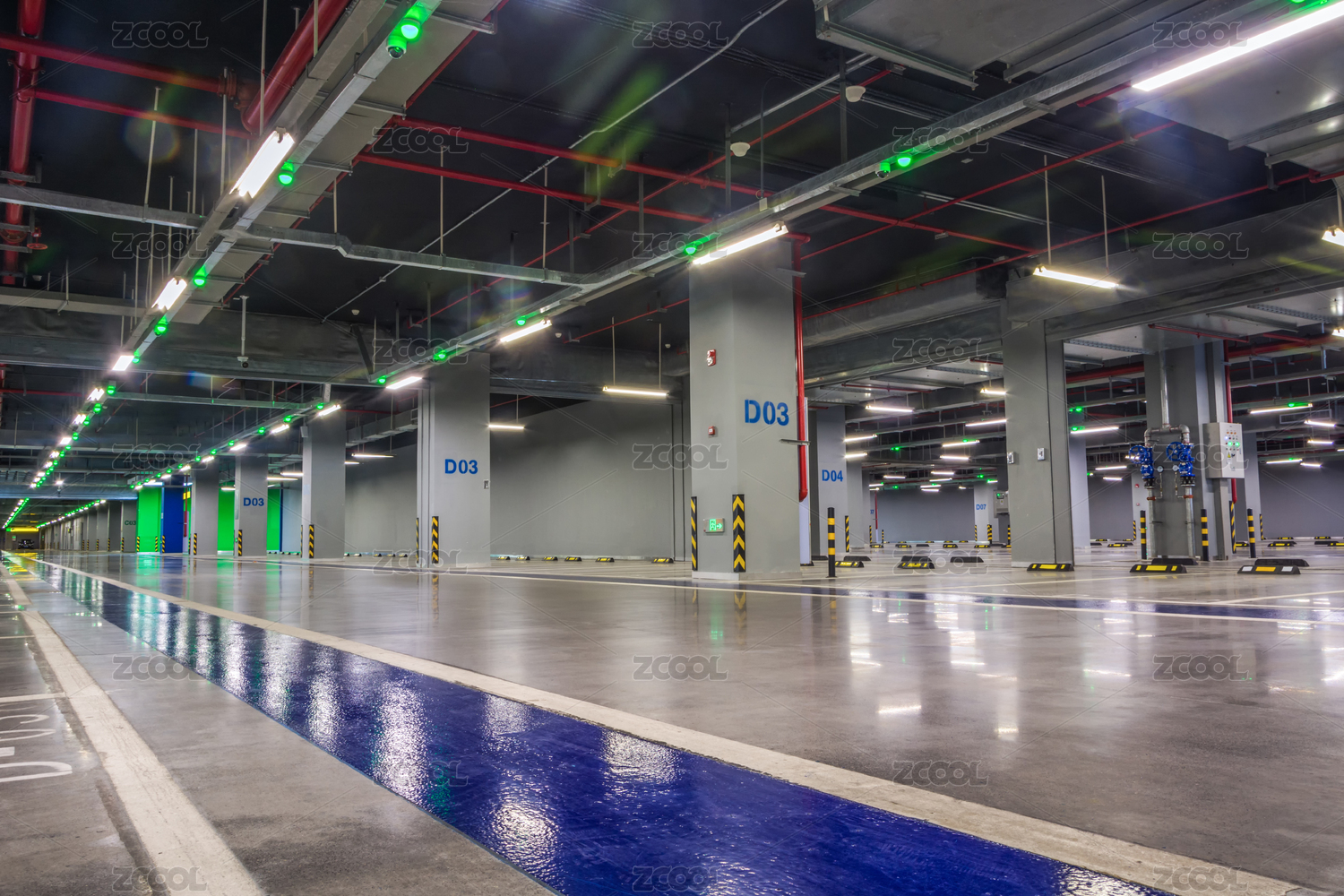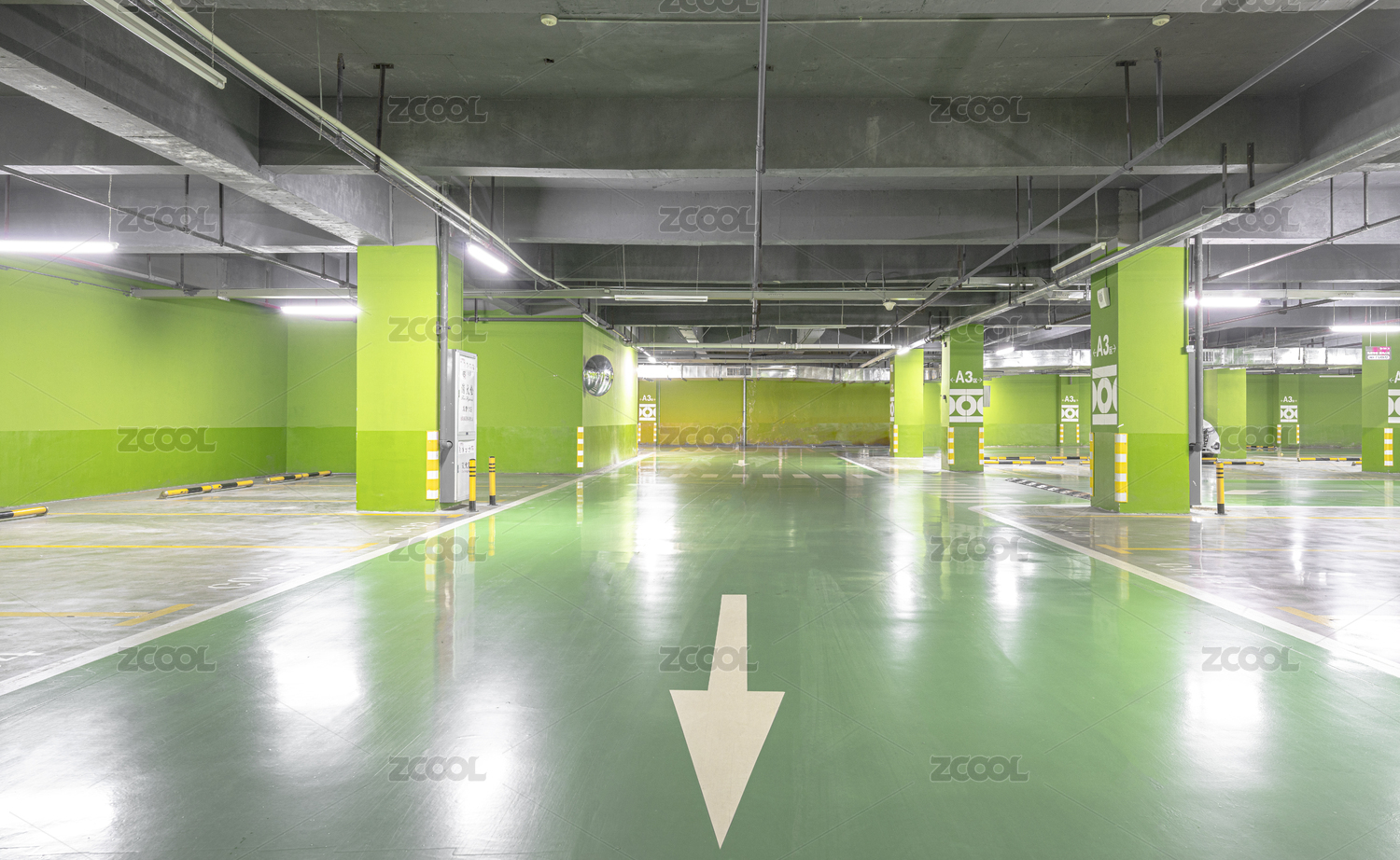 色彩鲜艳宽阔整洁的地下停车场