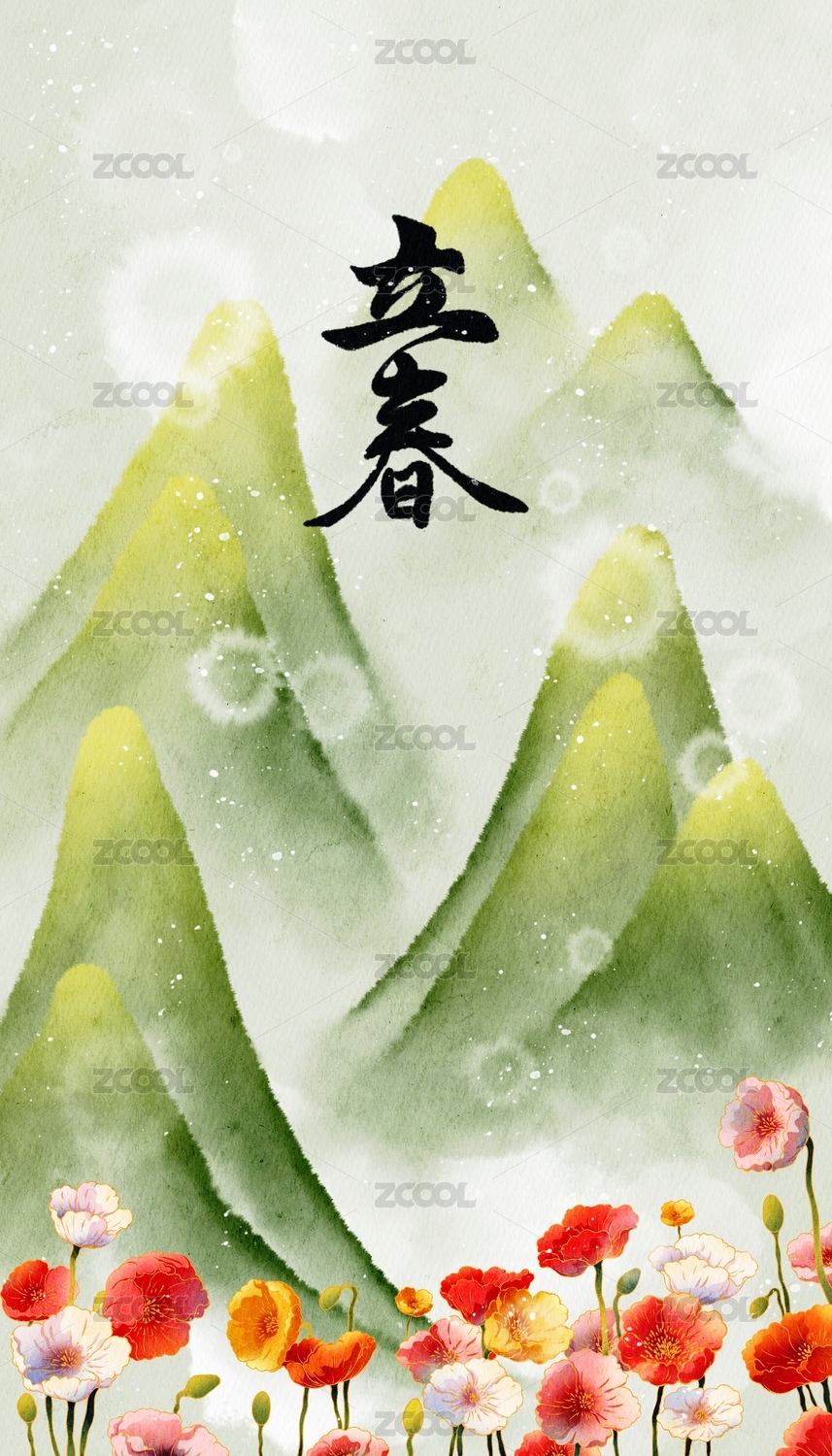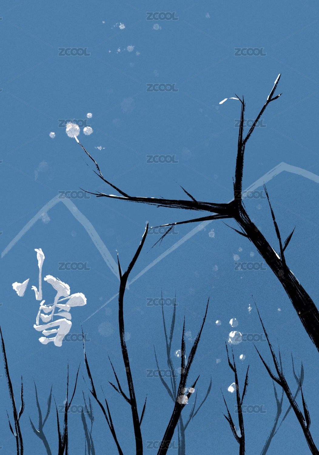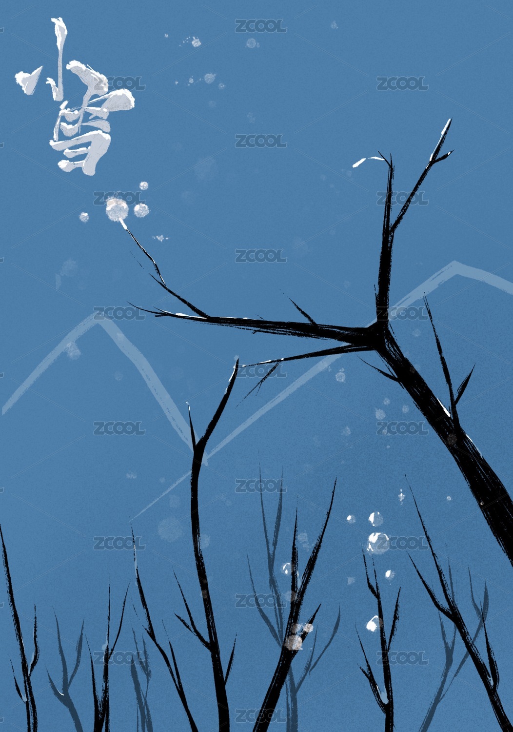 蓝色水墨风霜降国风水墨风景山峦树枝月亮