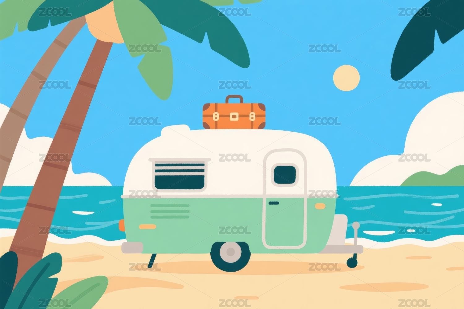 女孩,度假,旅行,海边,沙滩,大海,房车,扁平,插画,夏天