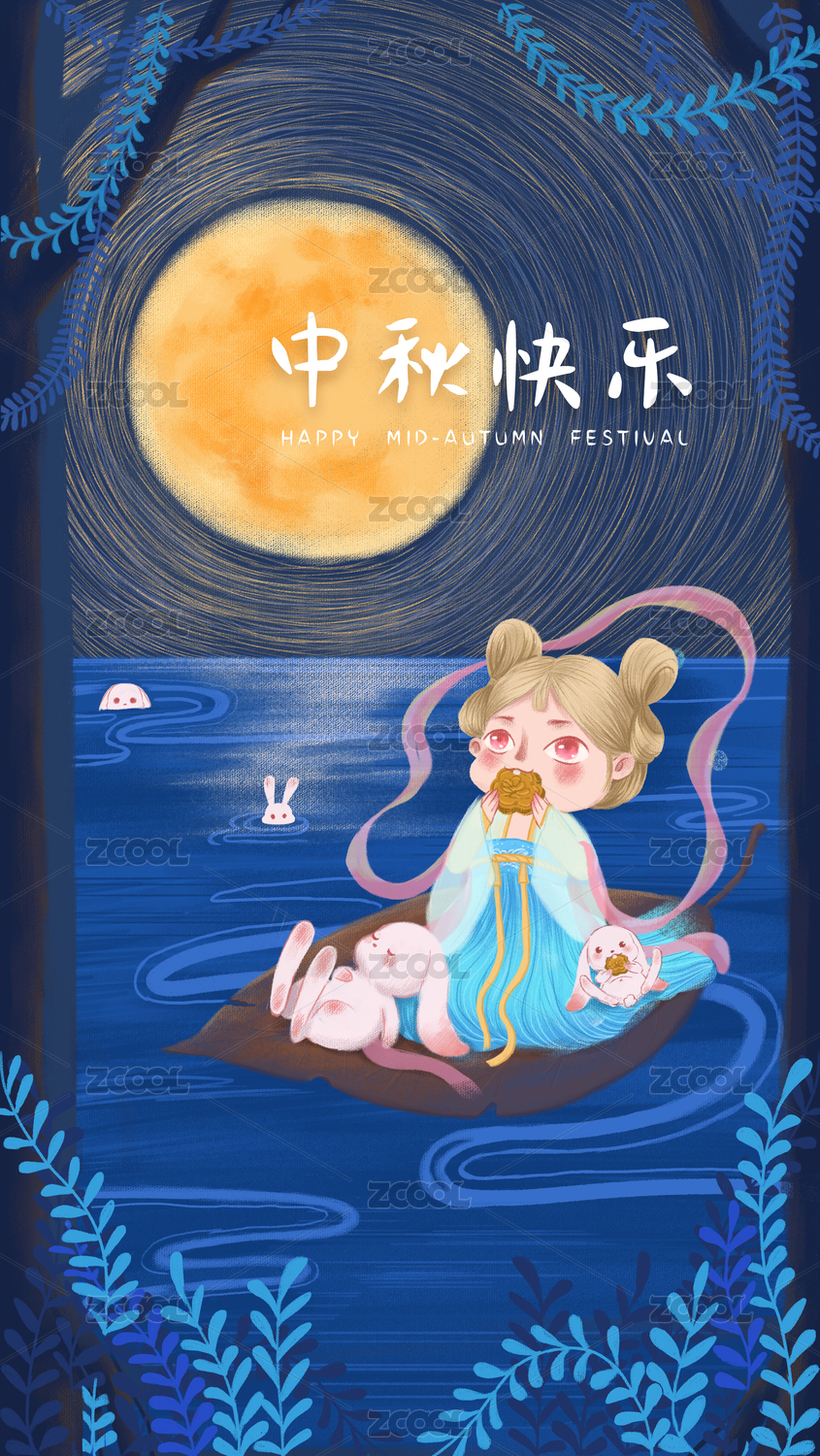 中秋节祥云月亮人物月饼兔子描边国潮矢量插画