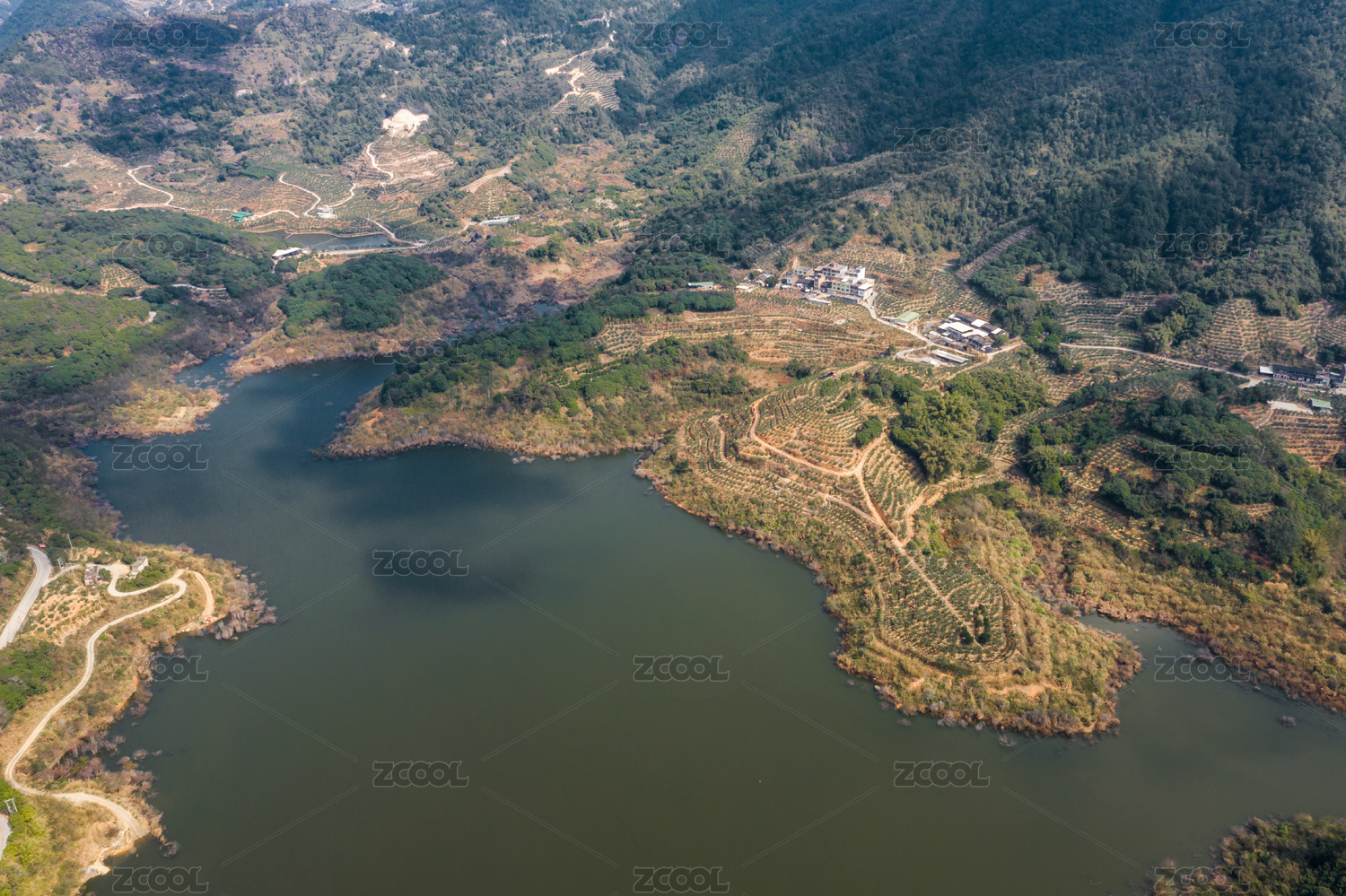 晴天航拍中国南方山区的水库