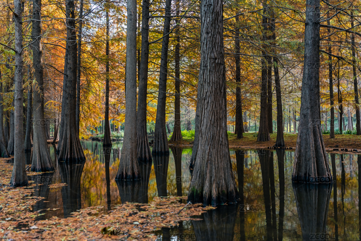 秋日水畔斑斓落羽杉