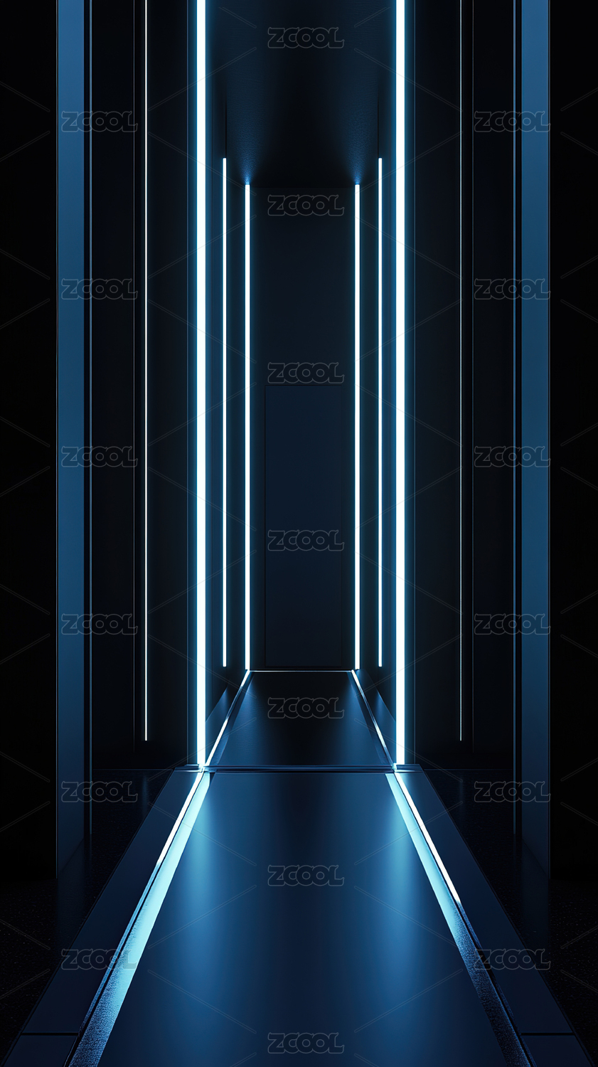 炫酷的蓝色霓虹灯照亮了科幻风格的圆形舞台