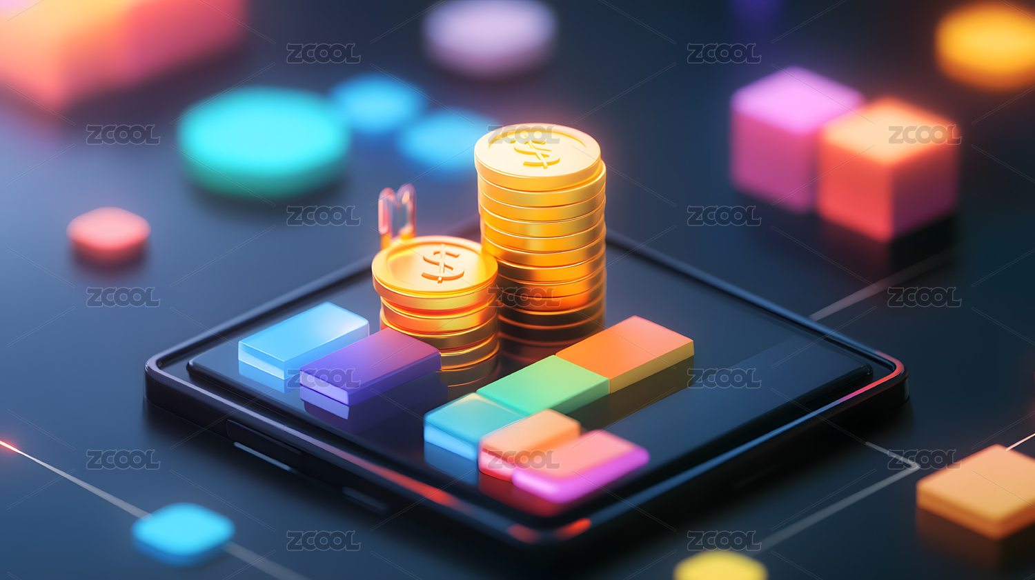 智能手机上的金币堆叠与图表