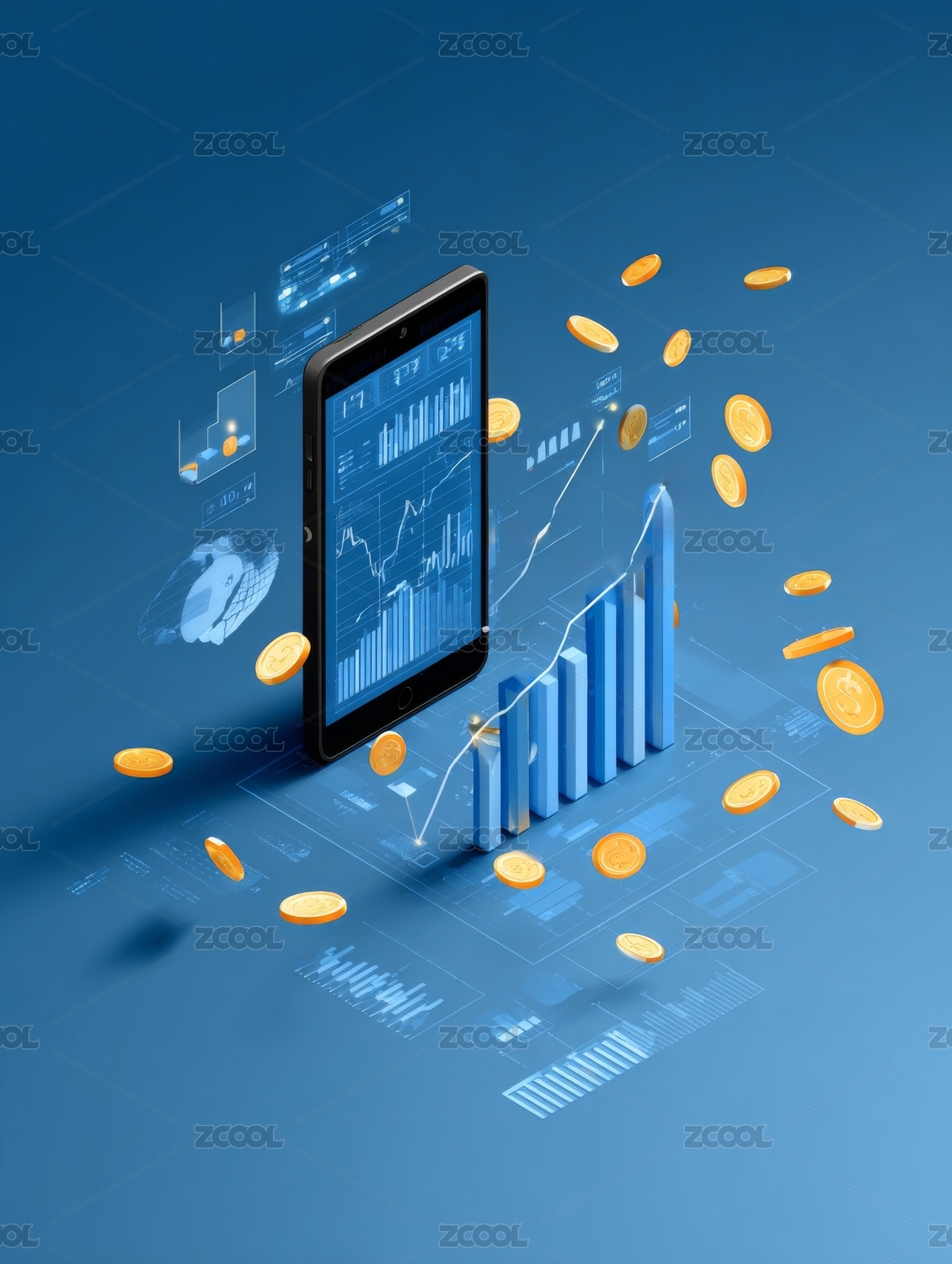 手机卡通柱状图图表和金币硬币金融图标