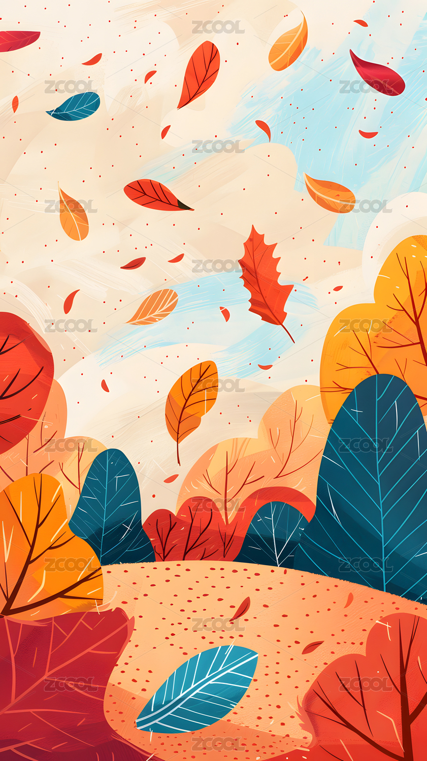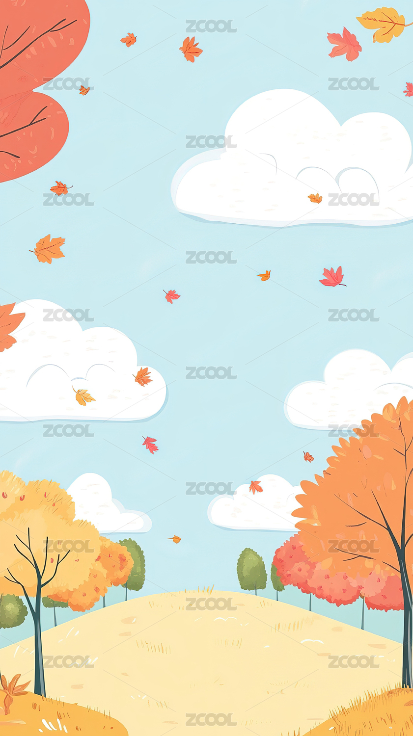 秋天扁平插画蓝天白云树木落叶壁纸竖版