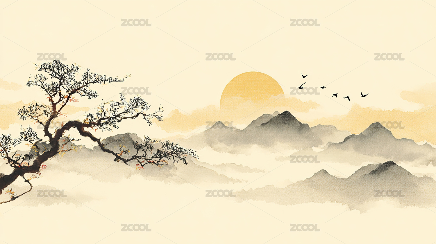 唯美山川悬崖松树中国风水墨画,古风山川松