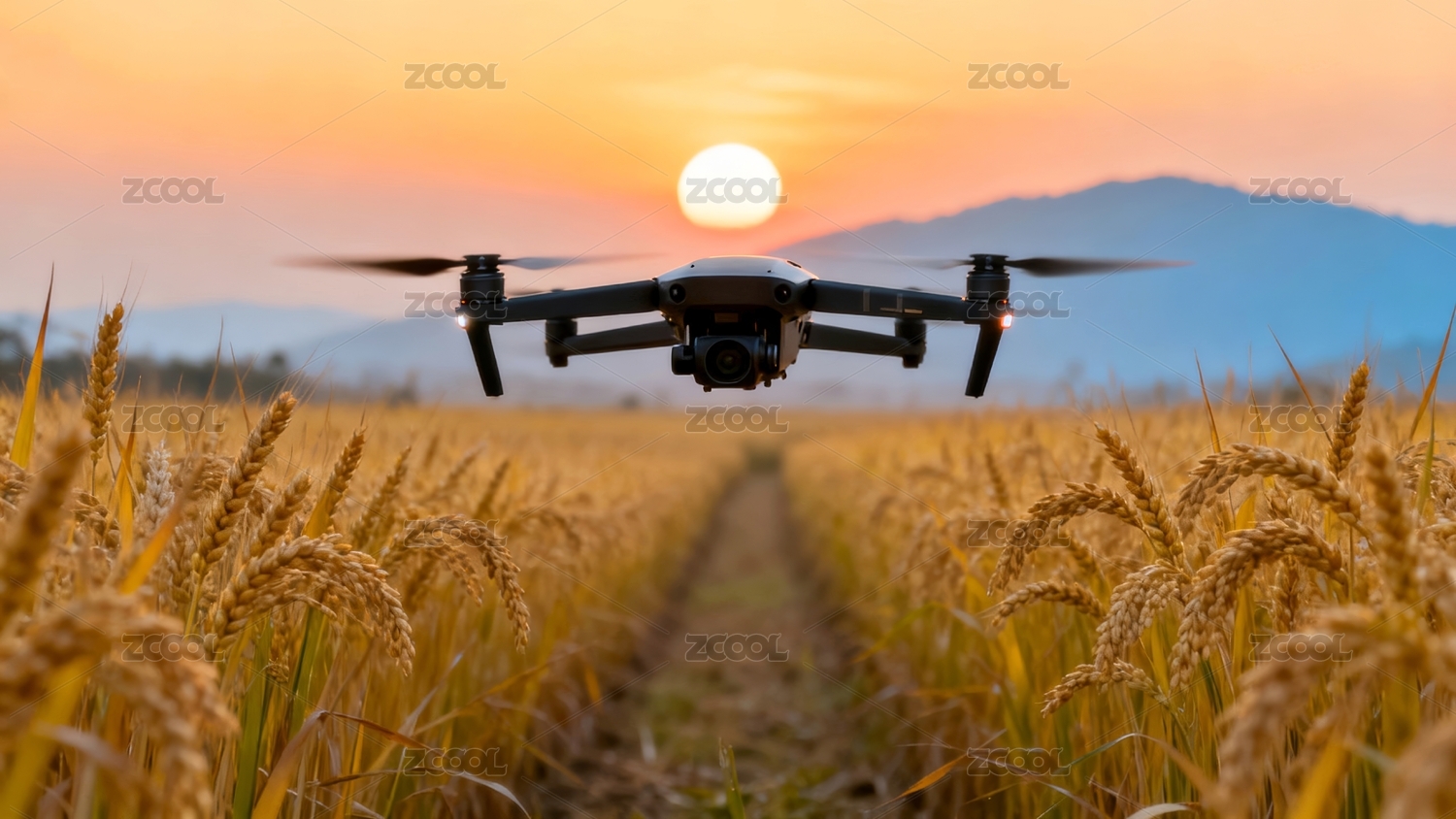 无人机在麦田上空捕捉夕阳余晖下的农田数据