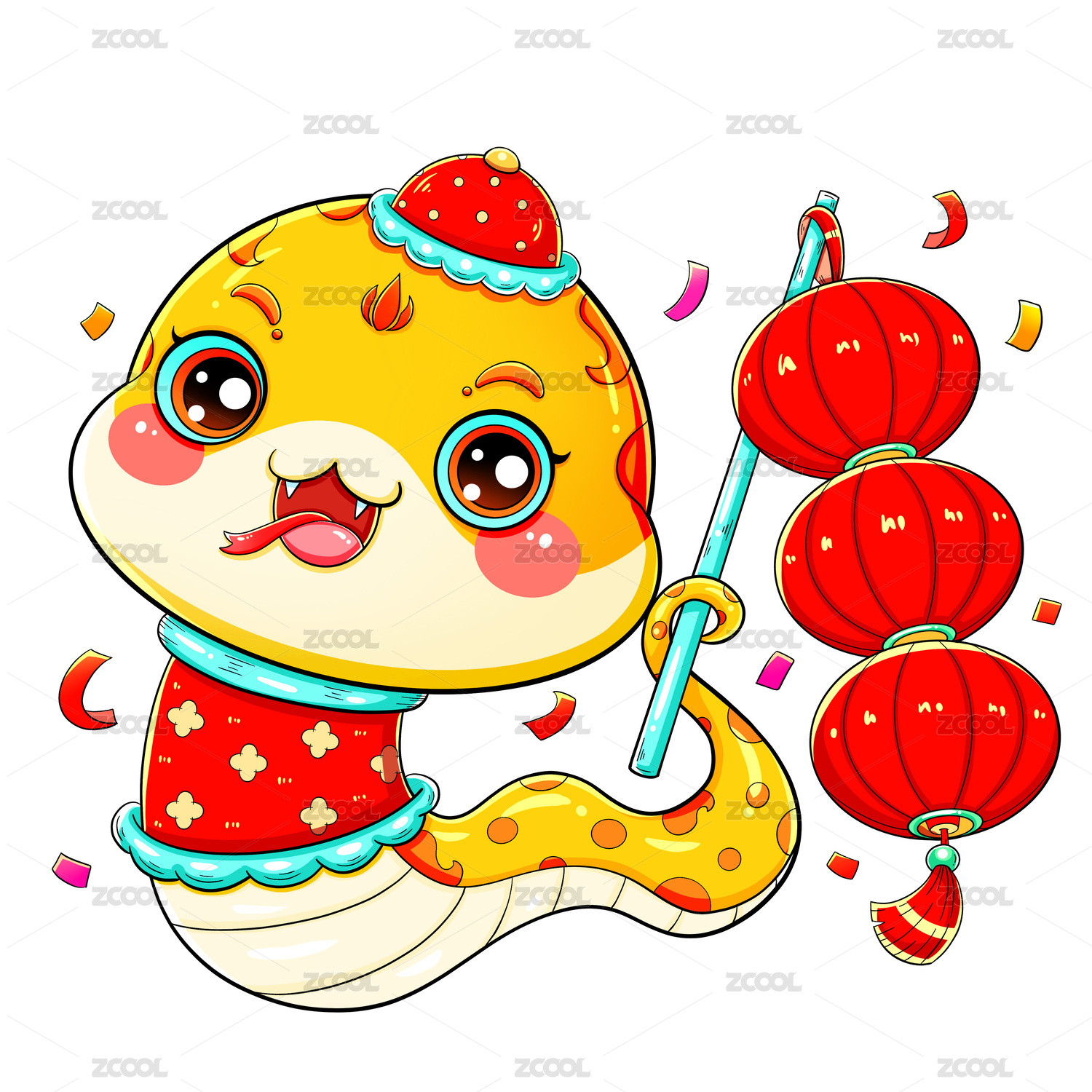 国潮春节新年可爱卡通灯笼蛇金蛇插画