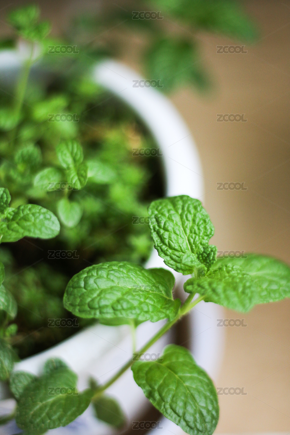 白色骨瓷盘中新鲜绿色的薄荷叶