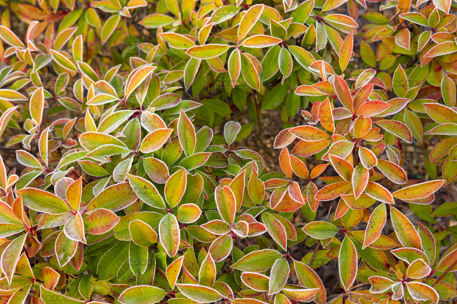 冬季结霜的海桐枝叶特写
