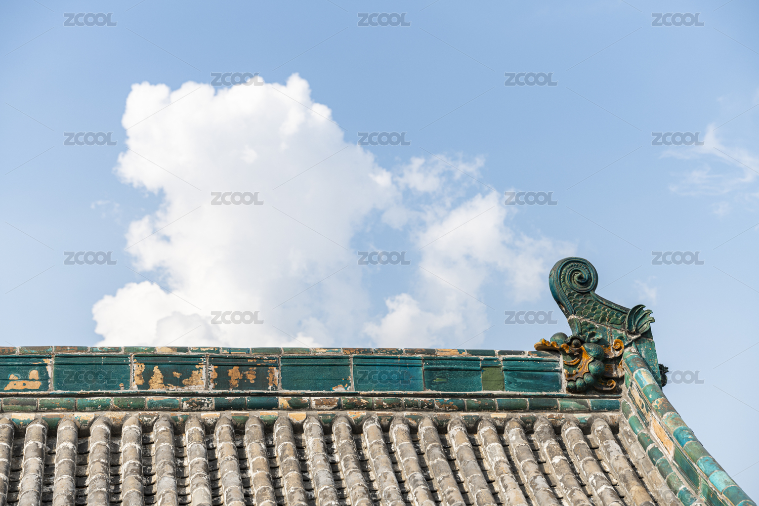 蓝天白云下的北京天坛公园古建筑仙人走兽