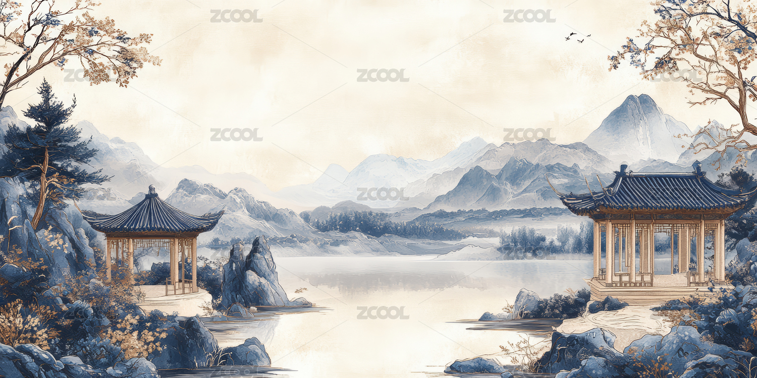 中国元素,中国文化,传统,古典,山水画,国风,极简,山岳,湖,船