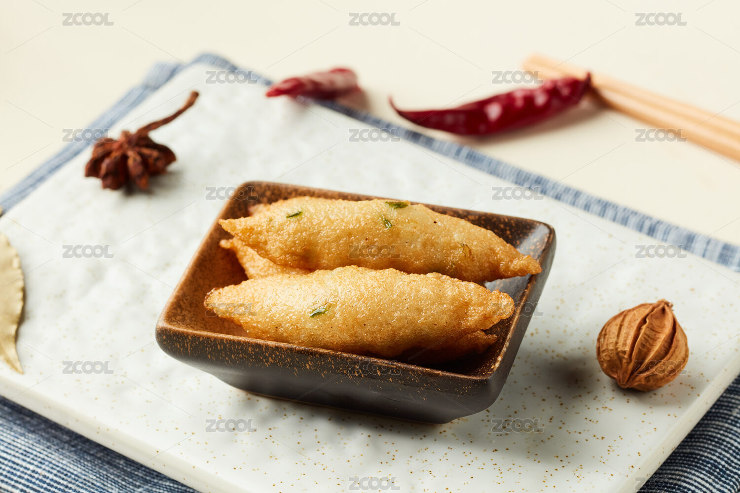 炸制成金黄色的油面筋摆放在深色盘子中
