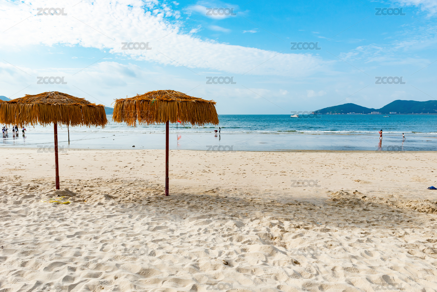 海南省三亚市亚龙湾休闲海滩上的遮阳棚和躺