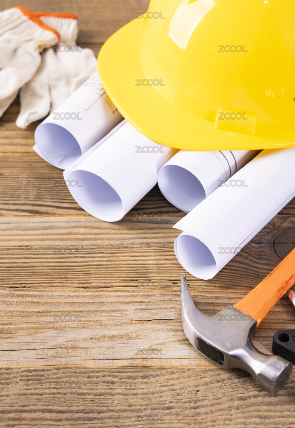 施工使用的黄色安全帽和卷着的图纸