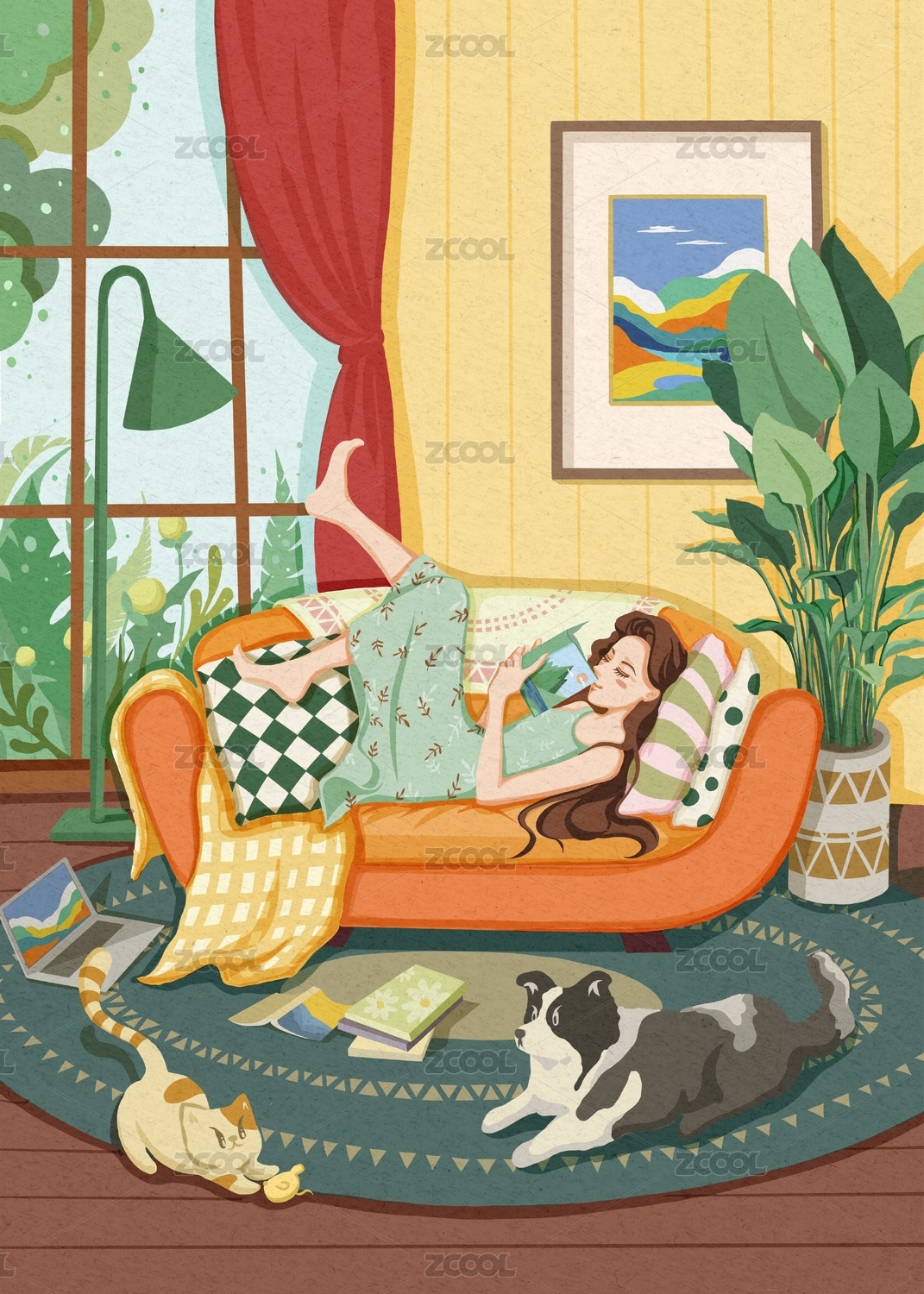 小清新手绘室内场景客厅沙发玩手机女孩插画