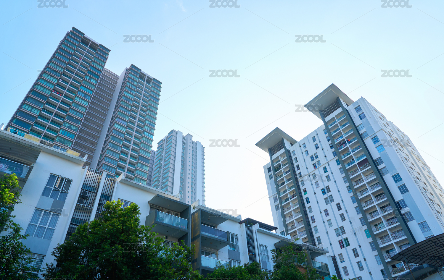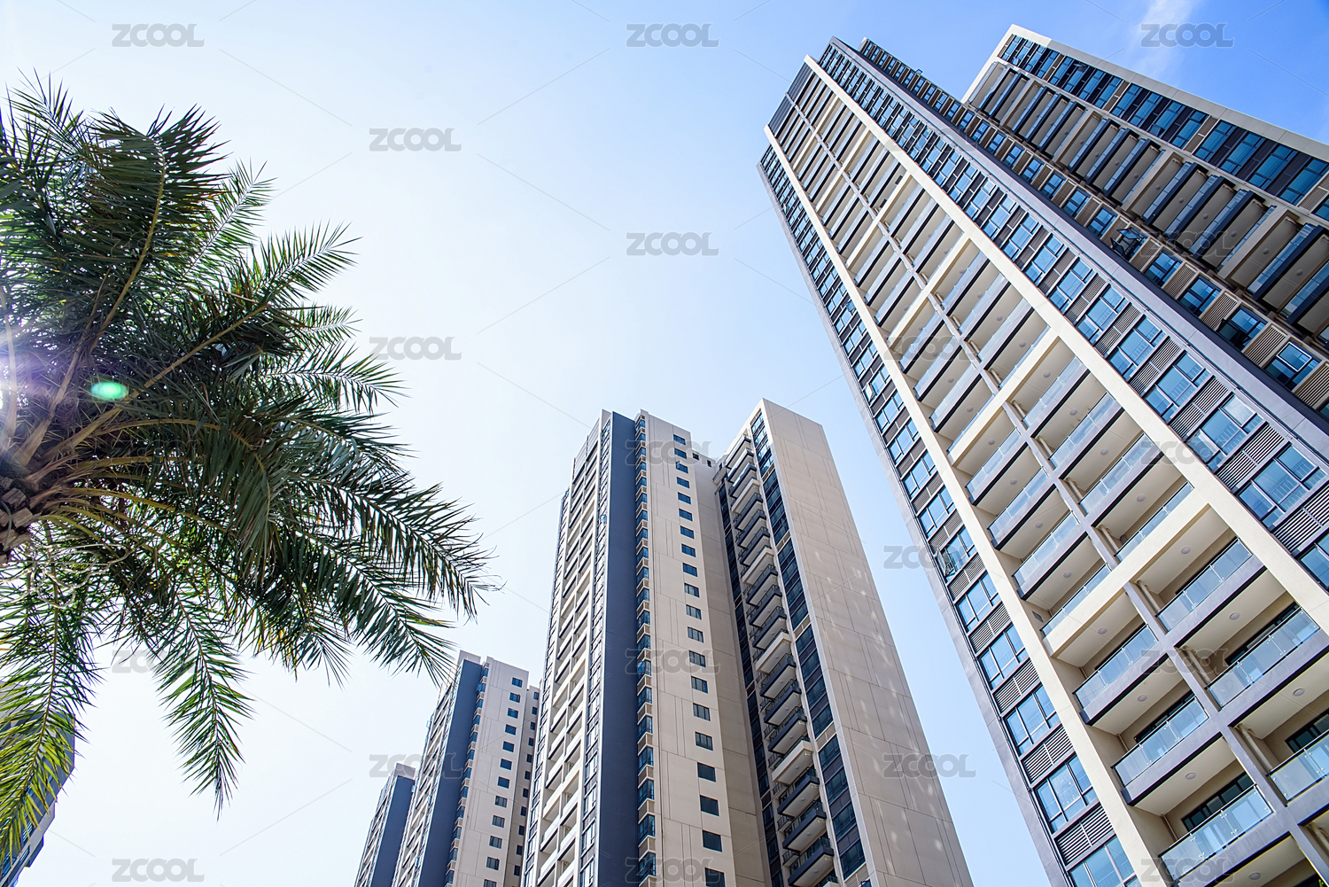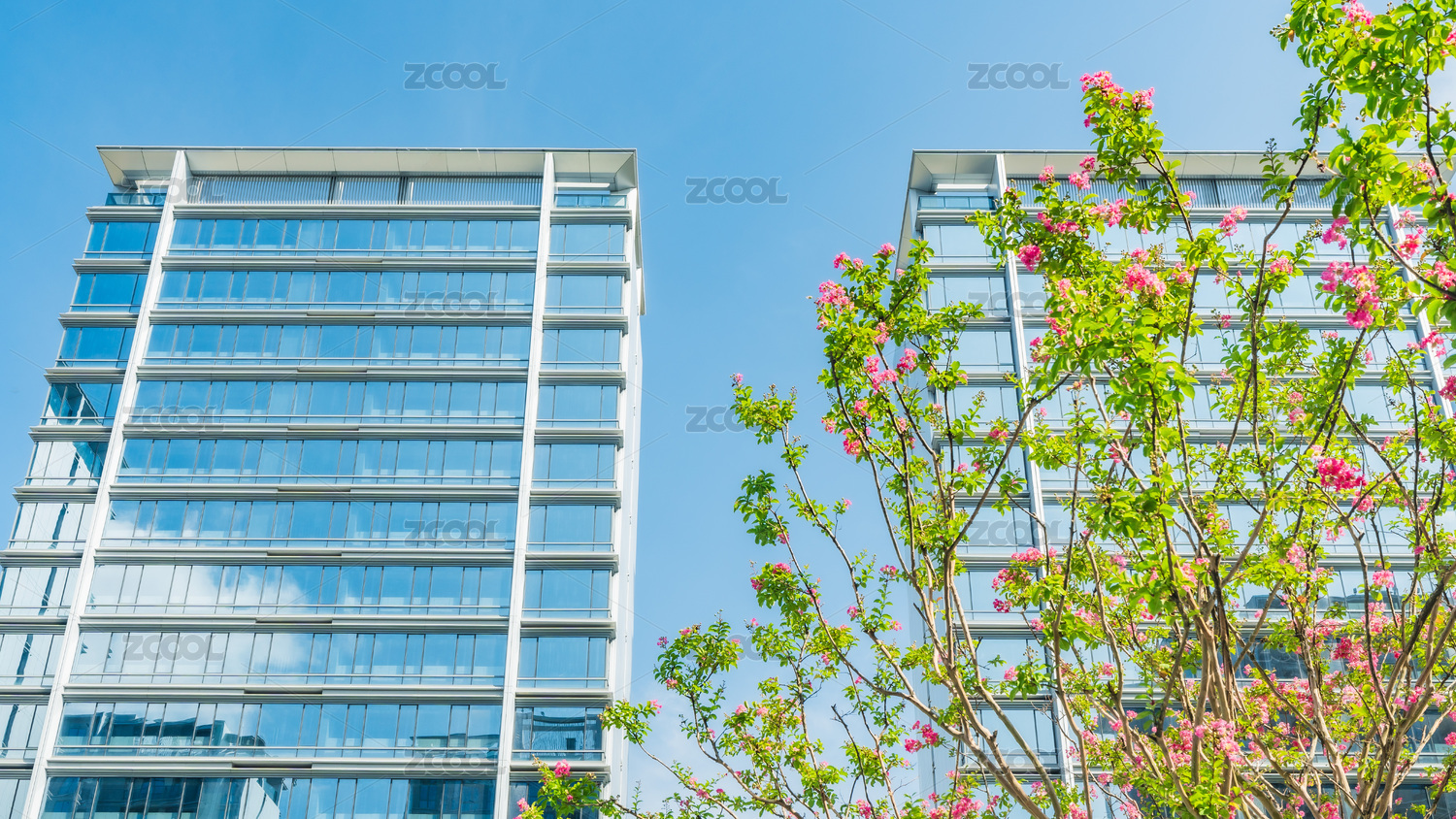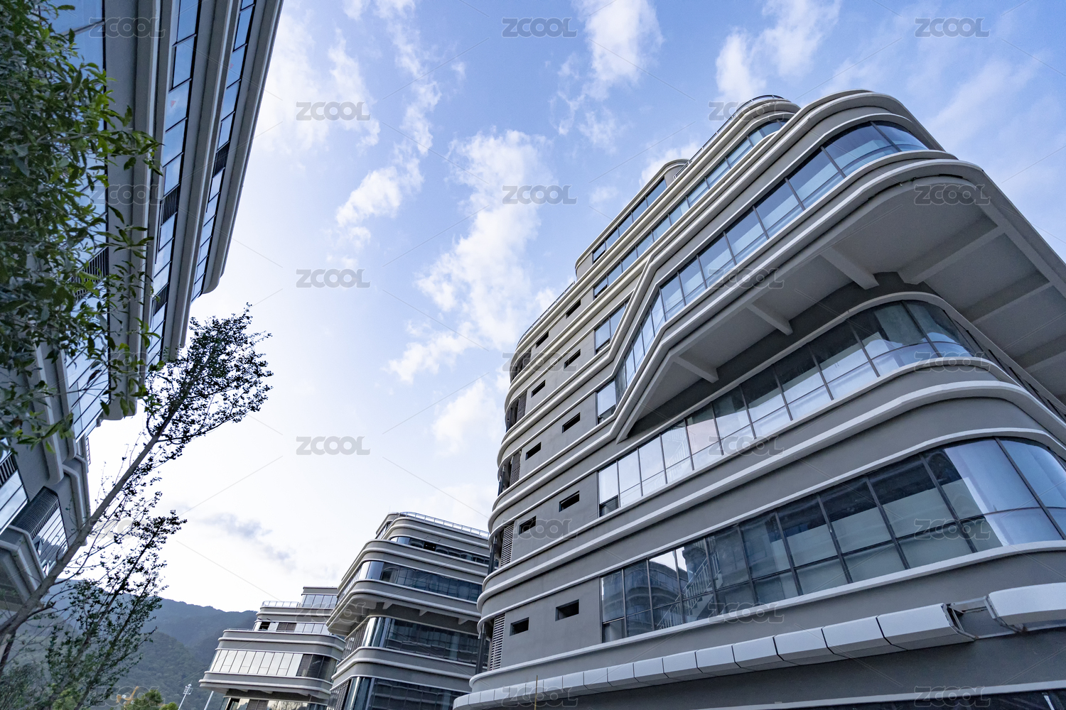 中国福建龙岩仰拍蓝天下的玻璃幕墙建筑