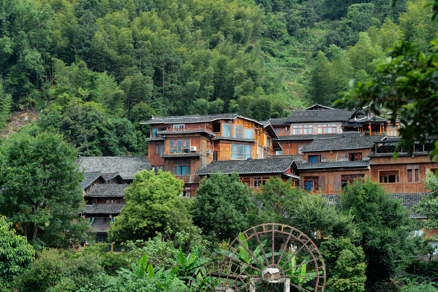 中国贵州肇兴侗寨的木制鼓楼建筑风光