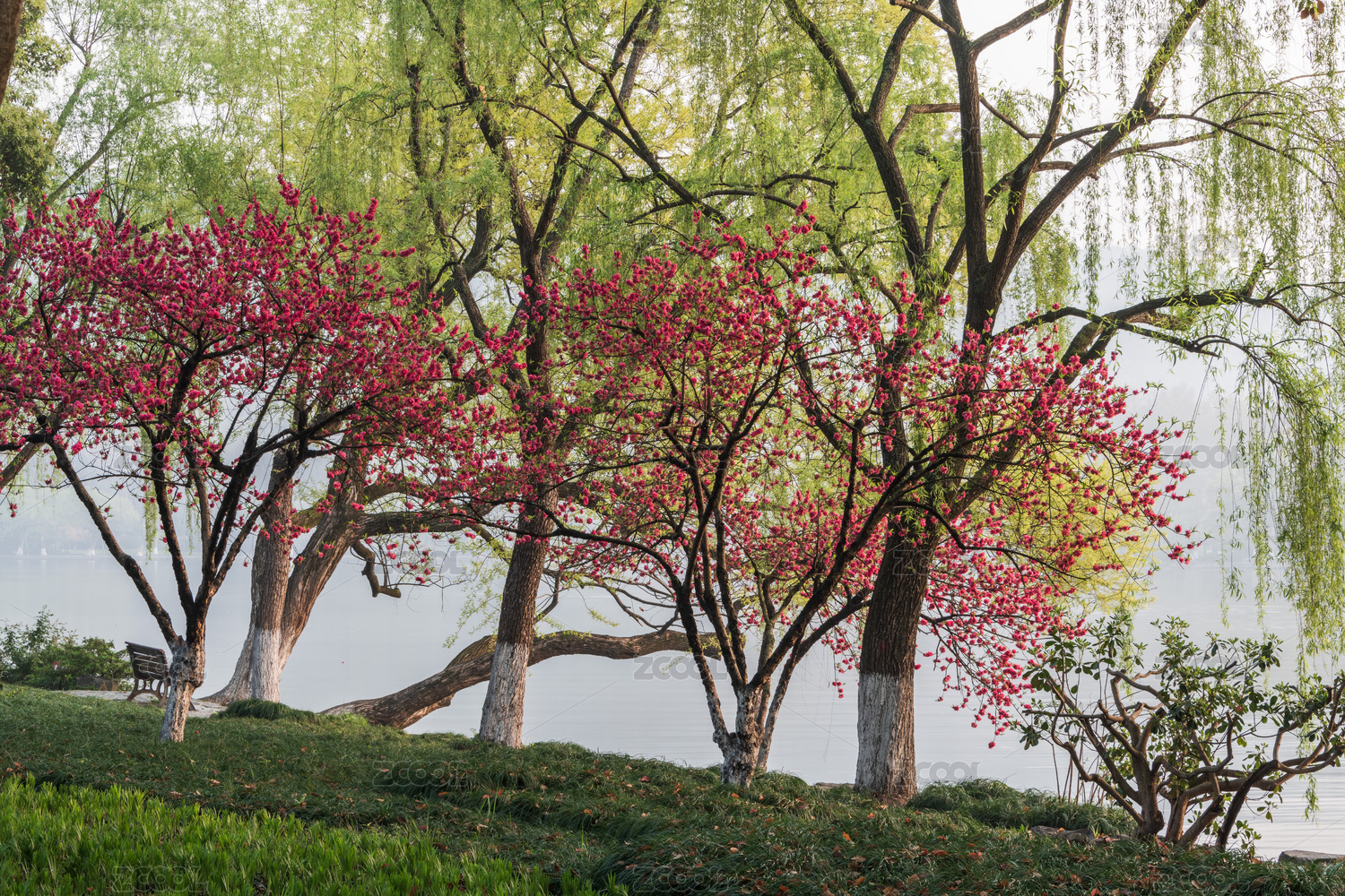 杭州西湖,苏堤,浙江,中国,杭州,春天,春季,柳树,樱花,风光