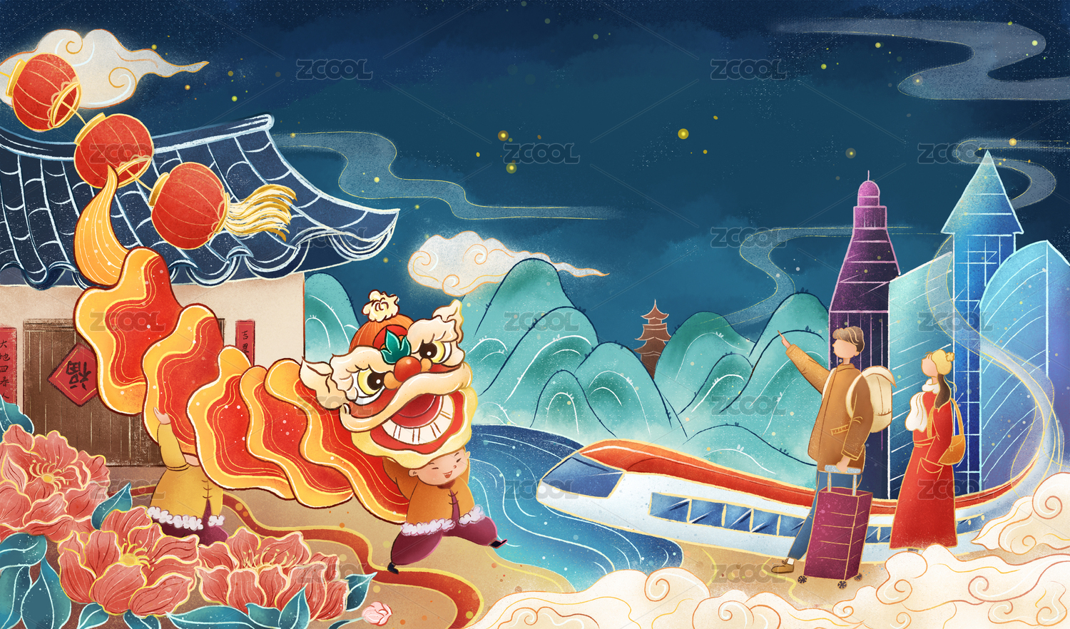 一对情侣春节乘坐动车回家过年看舞狮和烟花