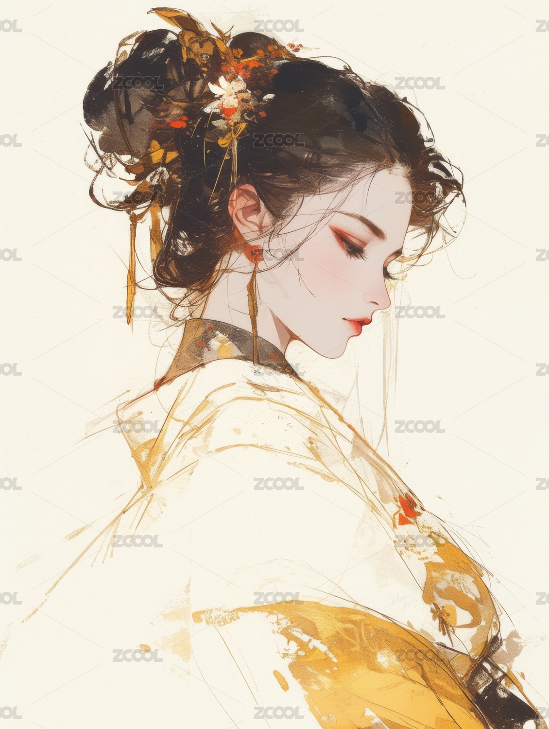 古典美人侧脸华丽服饰与精致发饰