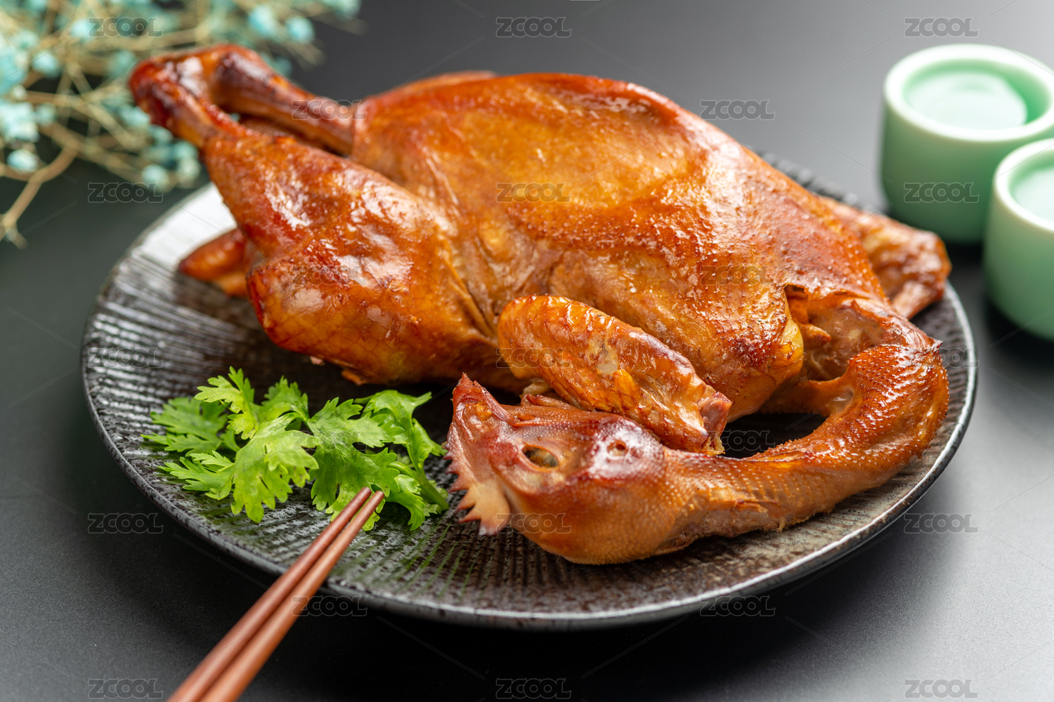 一盘整只烧鸡和酒杯摆放在黑色背景上
