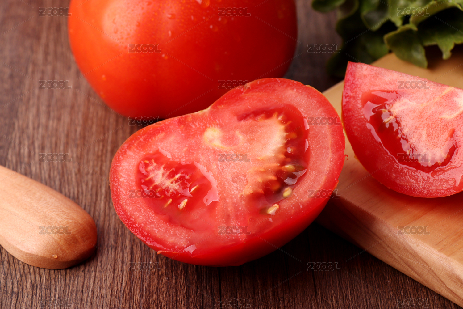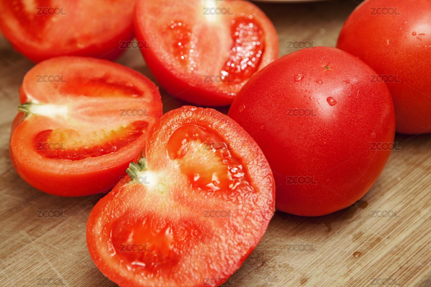 摆在木纹背景里的西红柿和西红柿切面