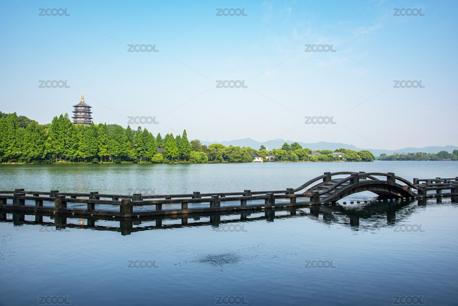 中国浙江杭州西湖雷峰塔和双投桥长桥风光