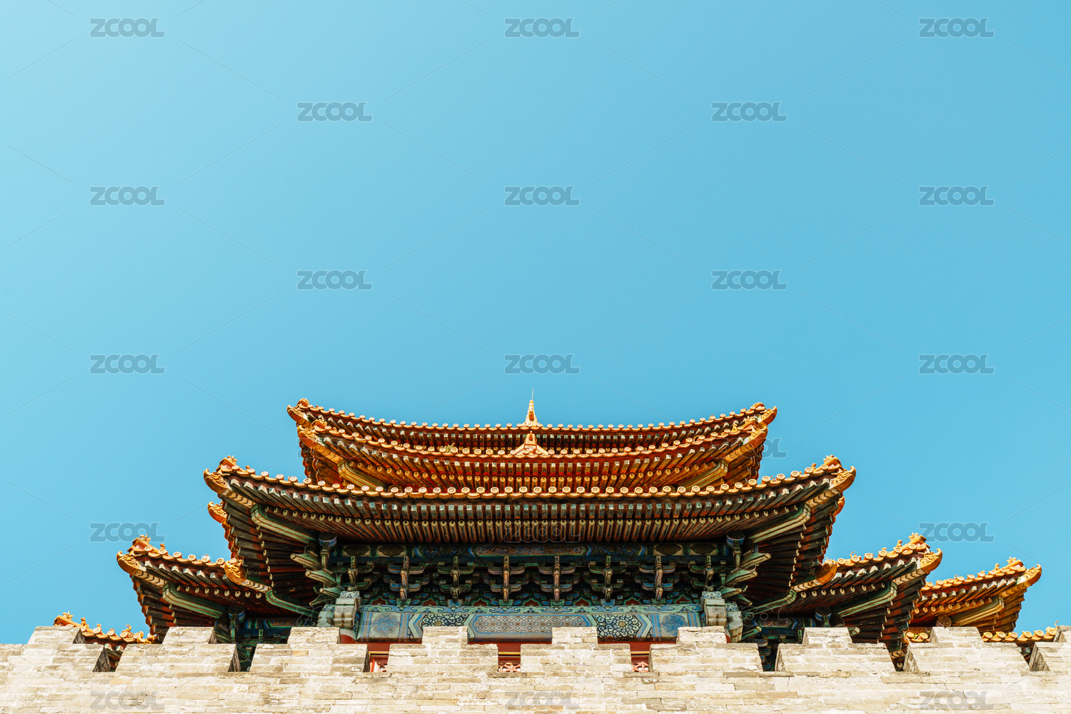 蓝天下阳光中的故宫东雁翅楼屋顶房檐特写