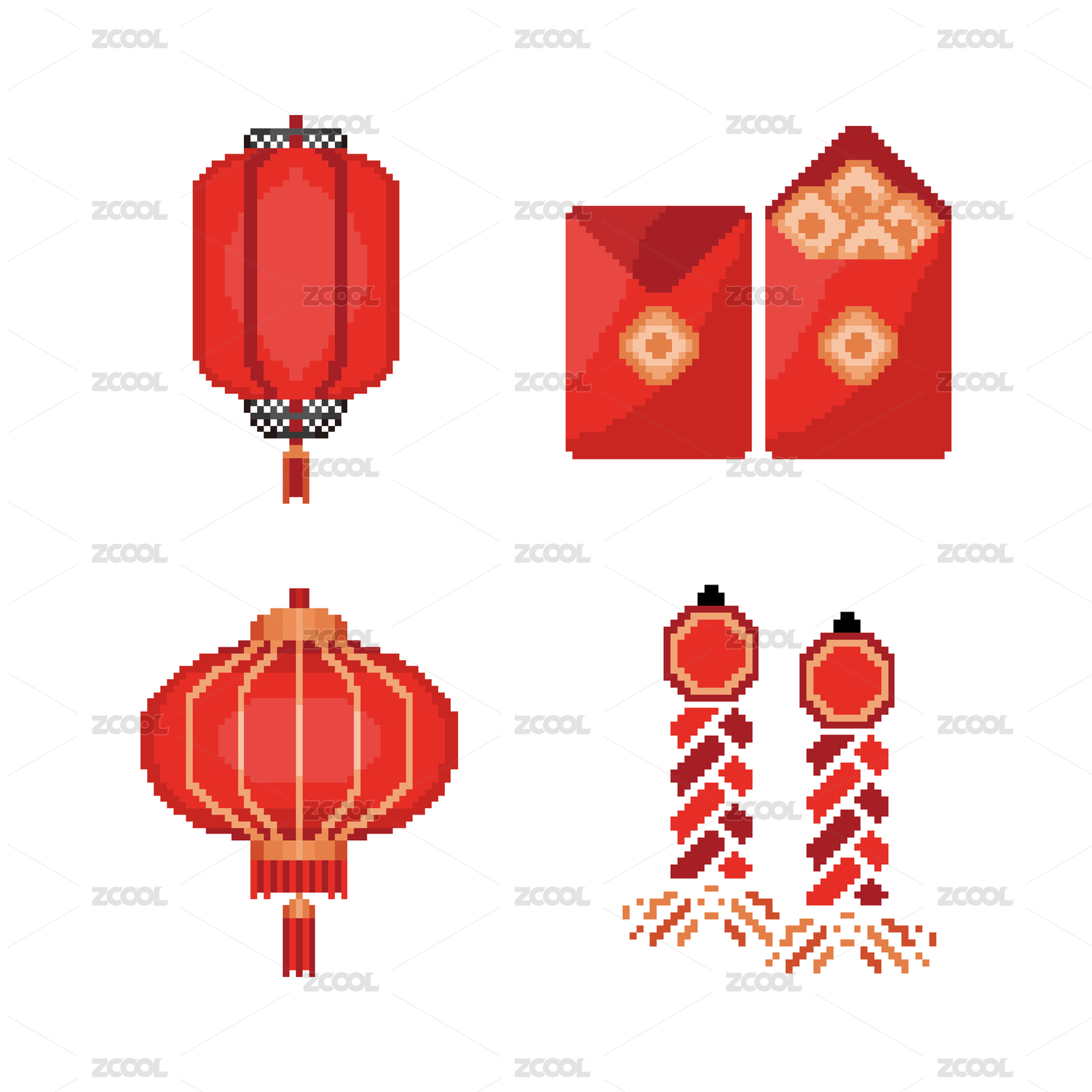 像素风矢量元旦新年中式灯笼鞭炮红包