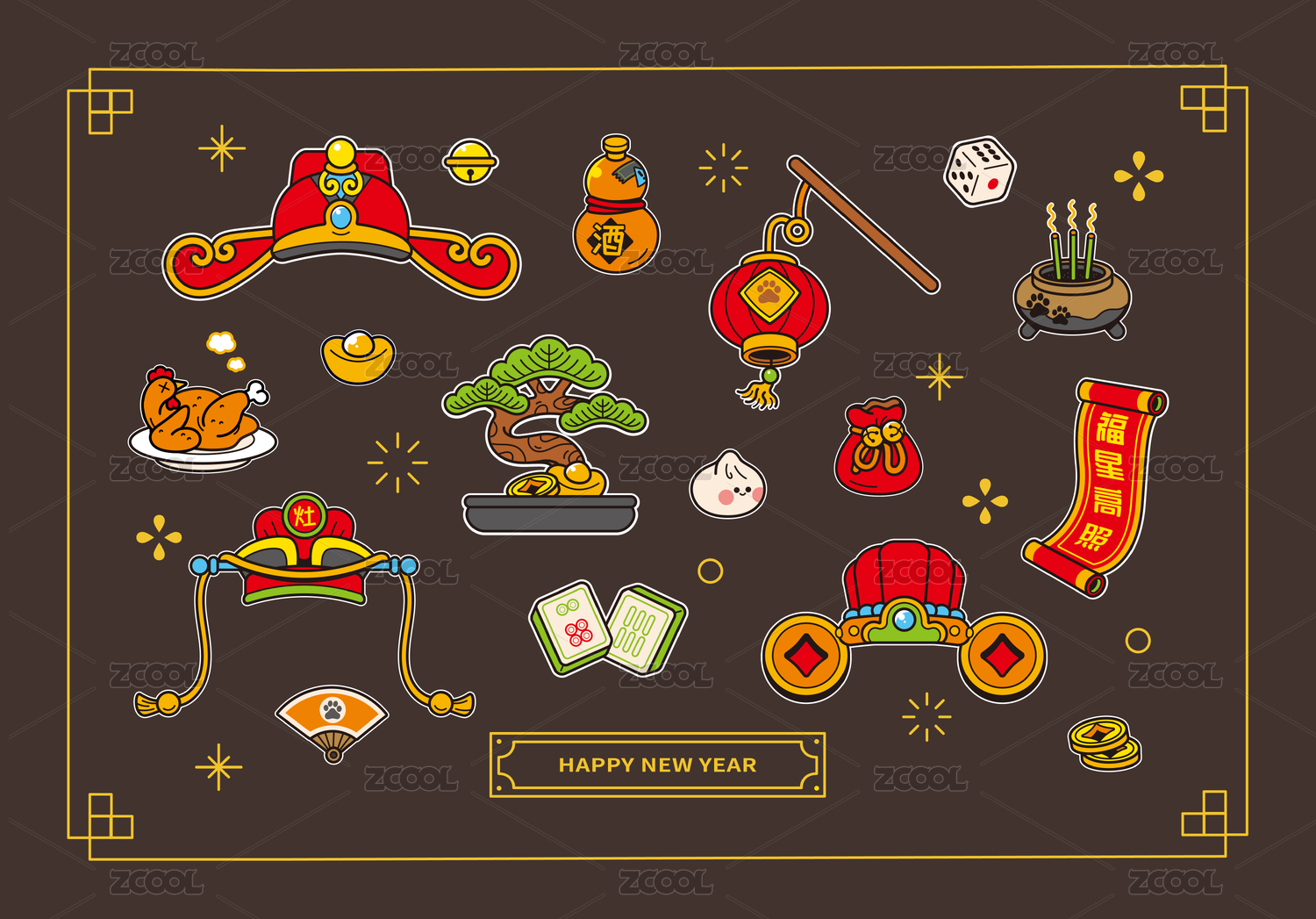 新年手绘元素春节福字灯笼锦鲤元宝鞭炮