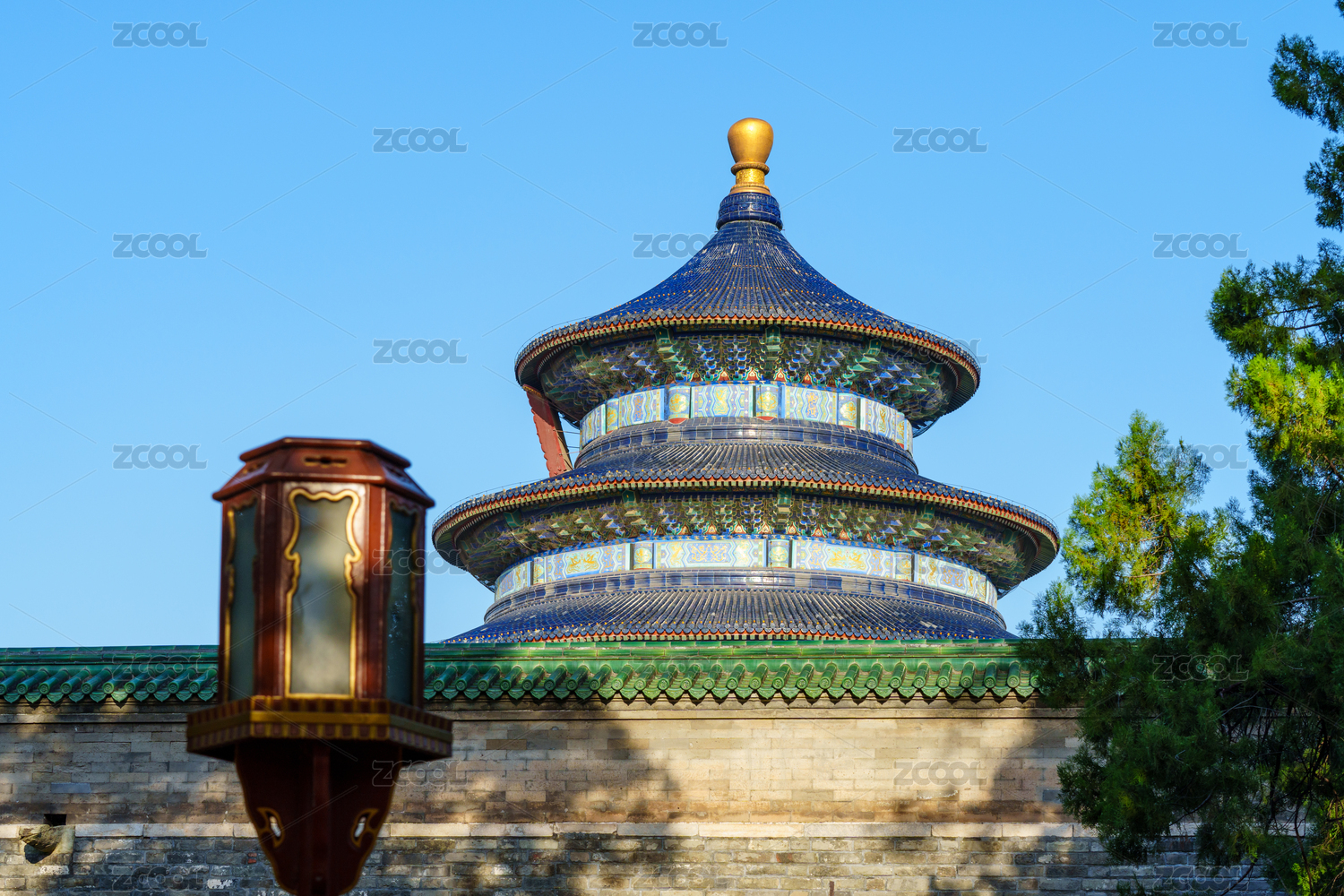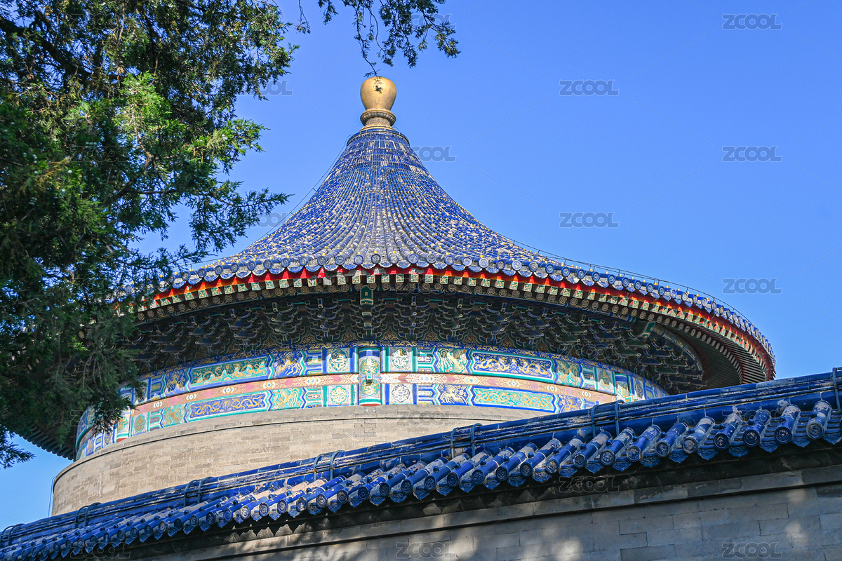 清晨阳光下的天坛皇穹宇蓝色屋顶特写