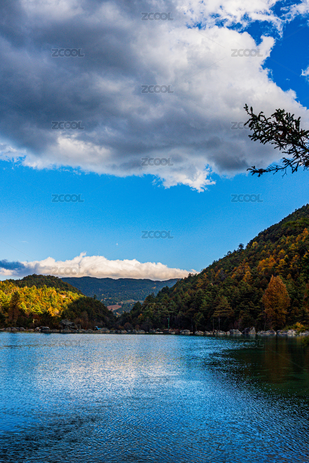 中国云南高原湖泊泸沽湖的蓝天白云和高山