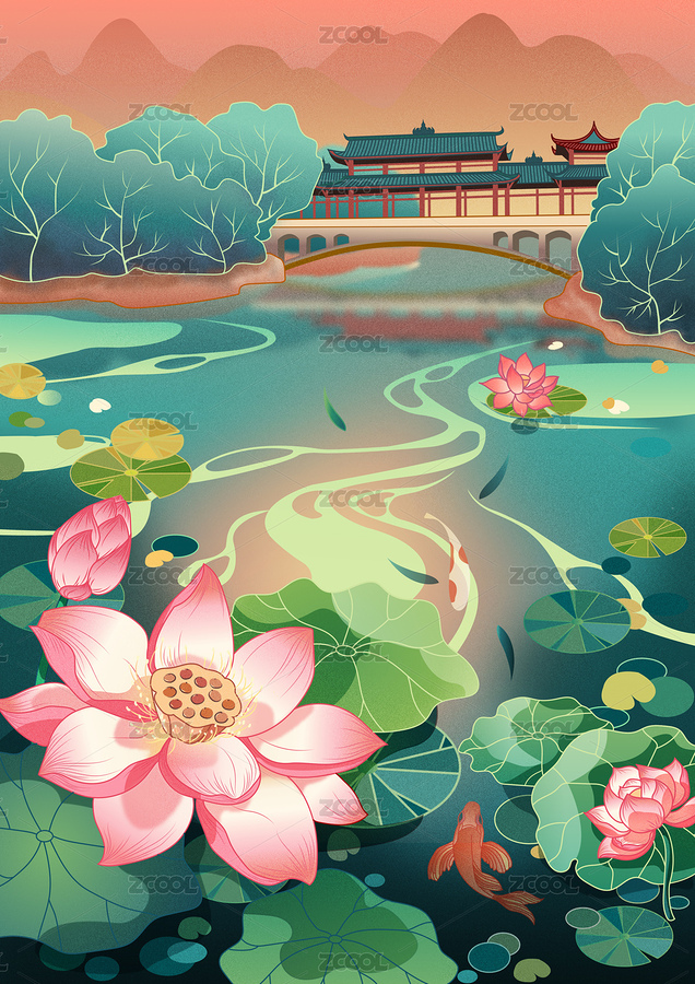 风雨桥,荷花,国风,远山,荷叶,游鱼,夏天