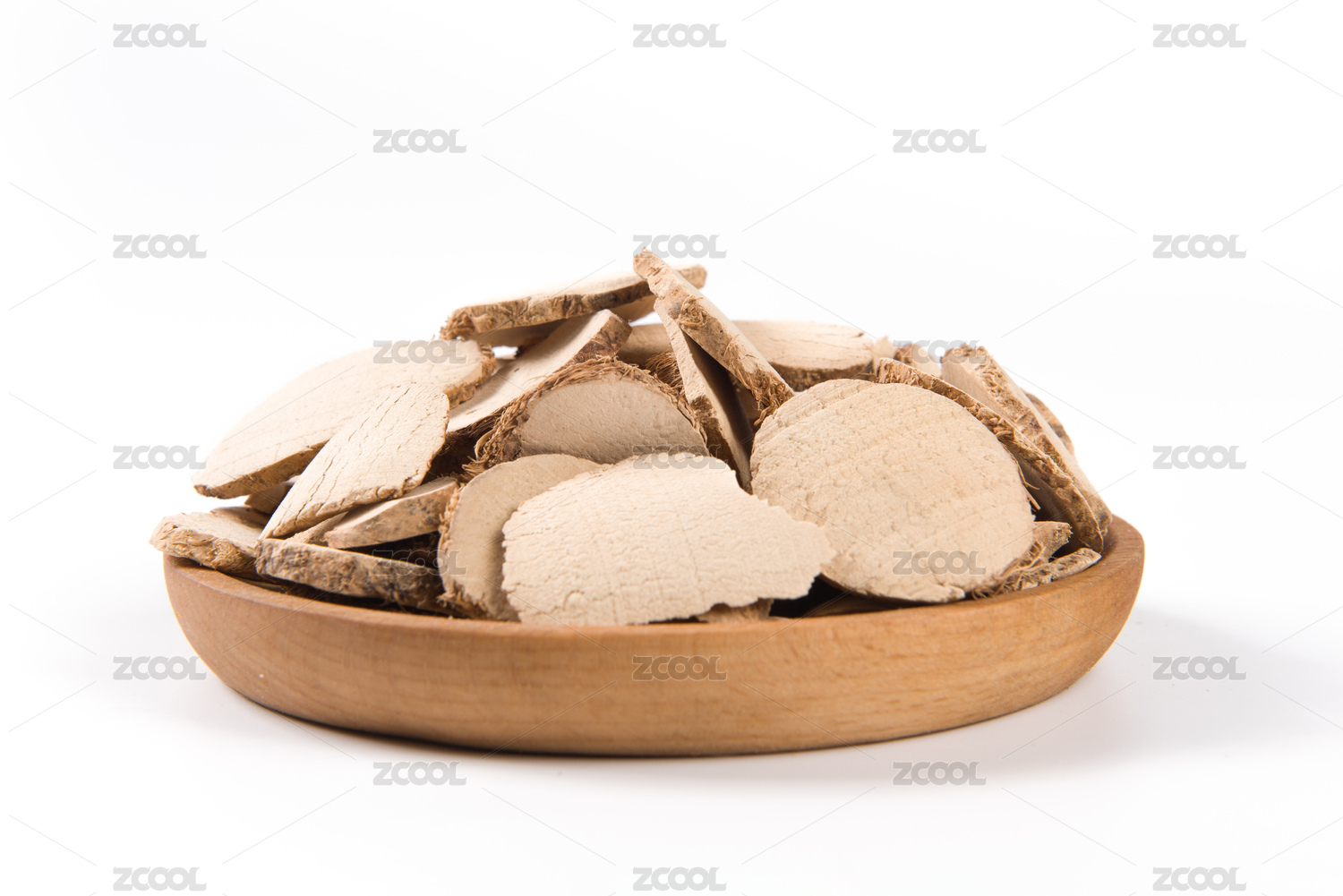 白色背景上摆放的芍片中药白