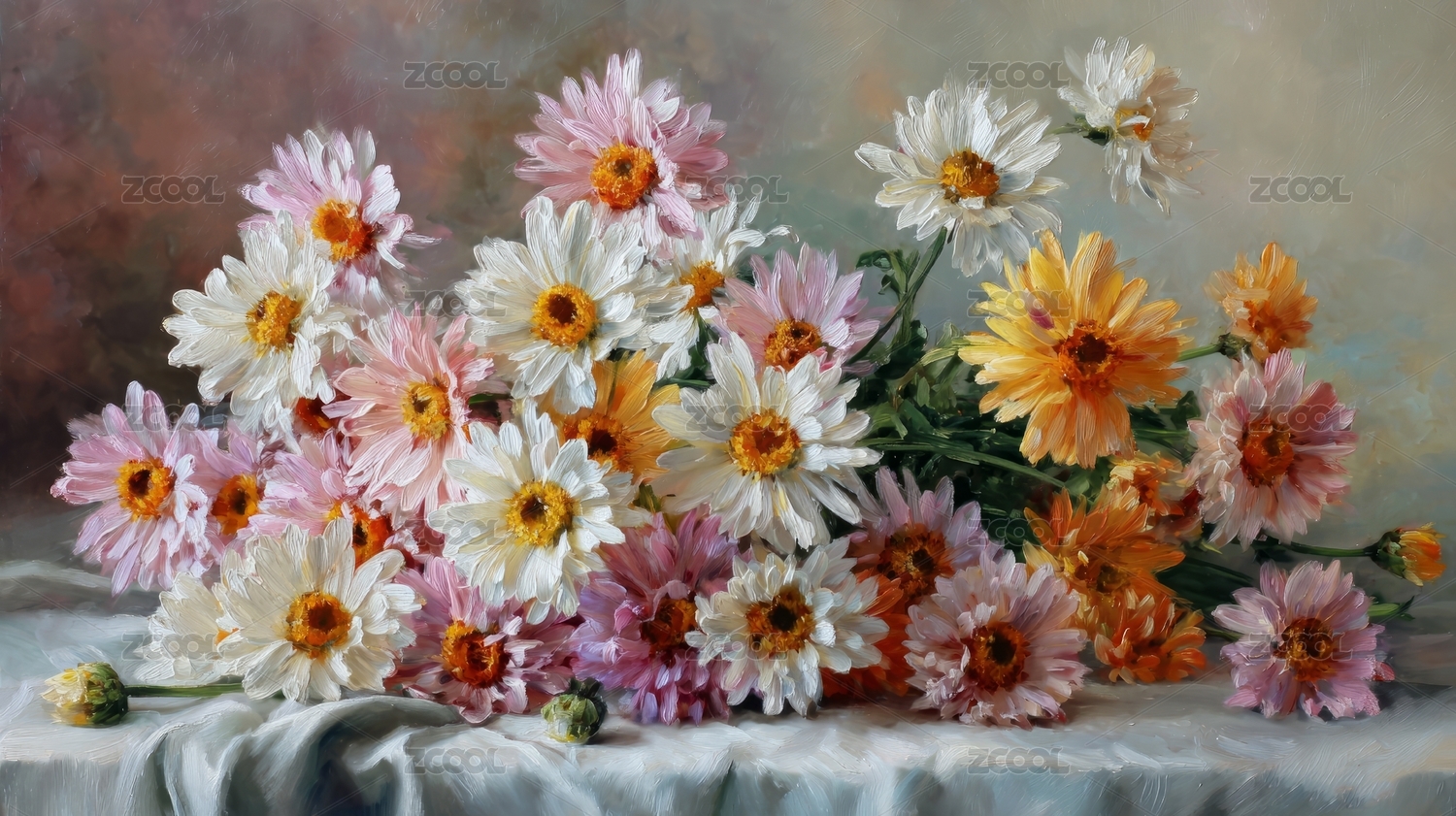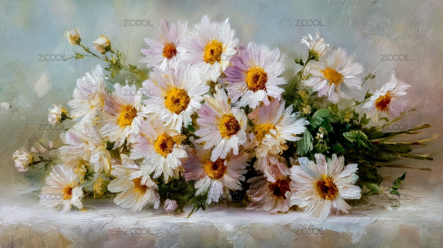 厚涂粗笔触刮刀雏菊花束夏天花束背景海报