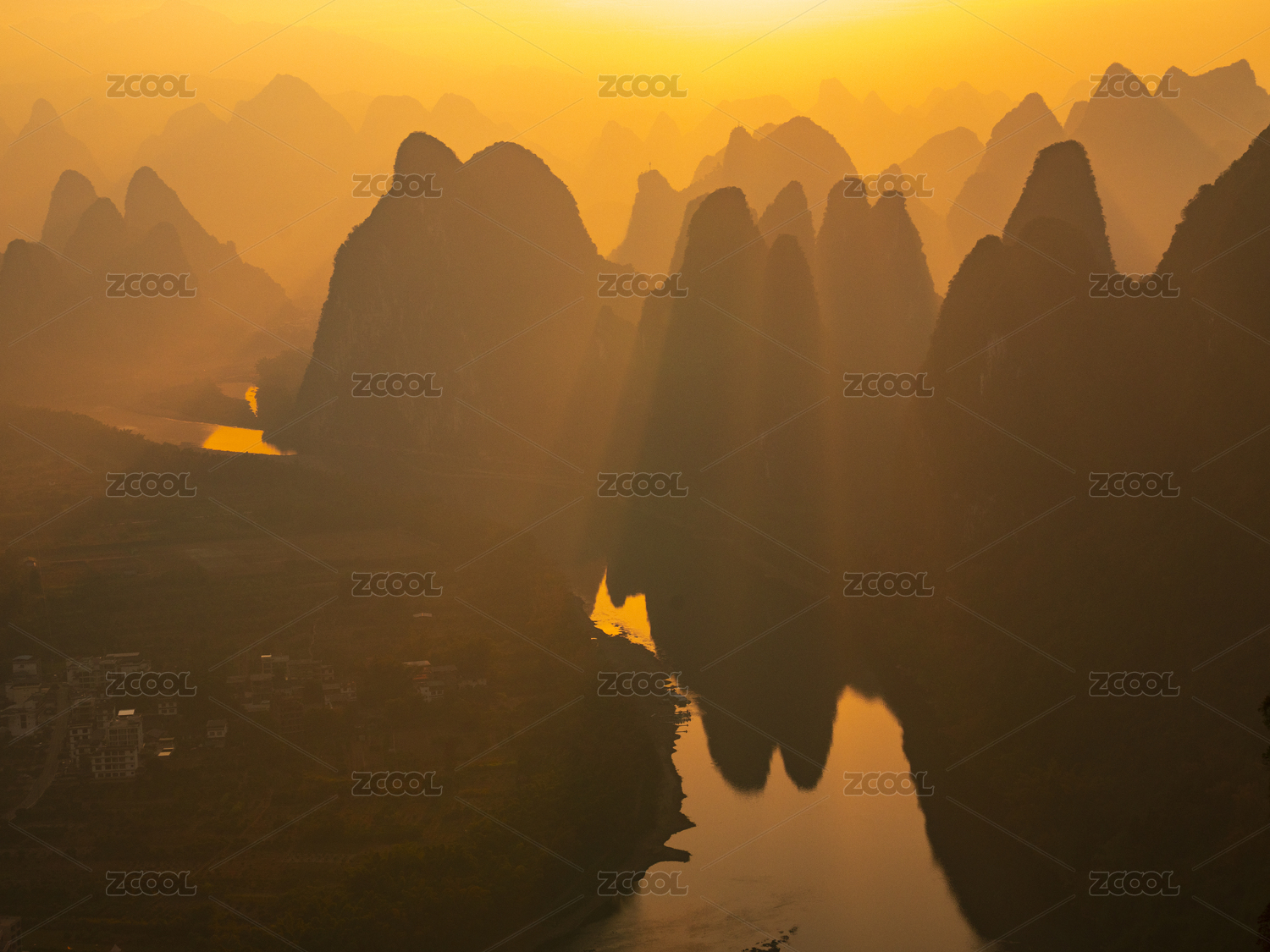 航拍中国广西桂林日出时喀斯特山脉晨雾风光