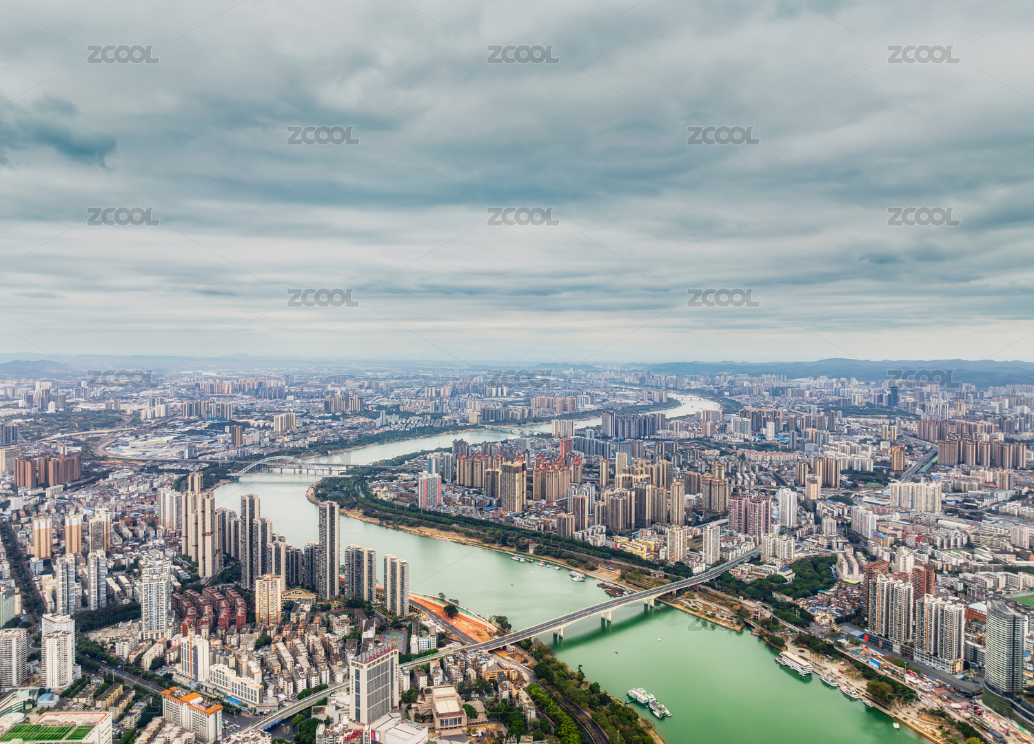 中国广东省清远市北江两岸建筑桥梁航拍景观