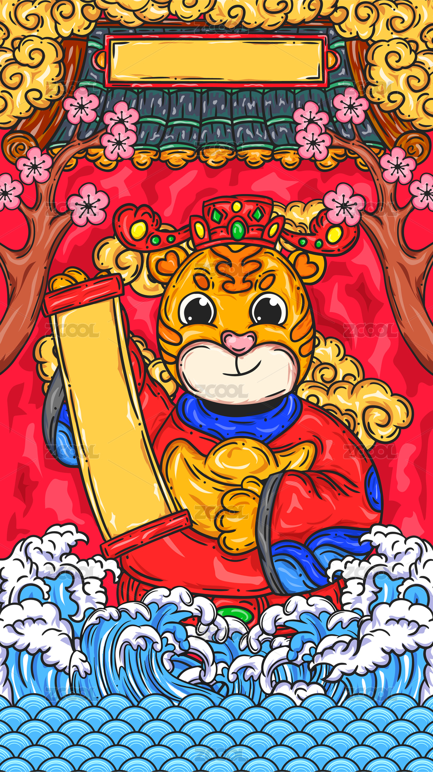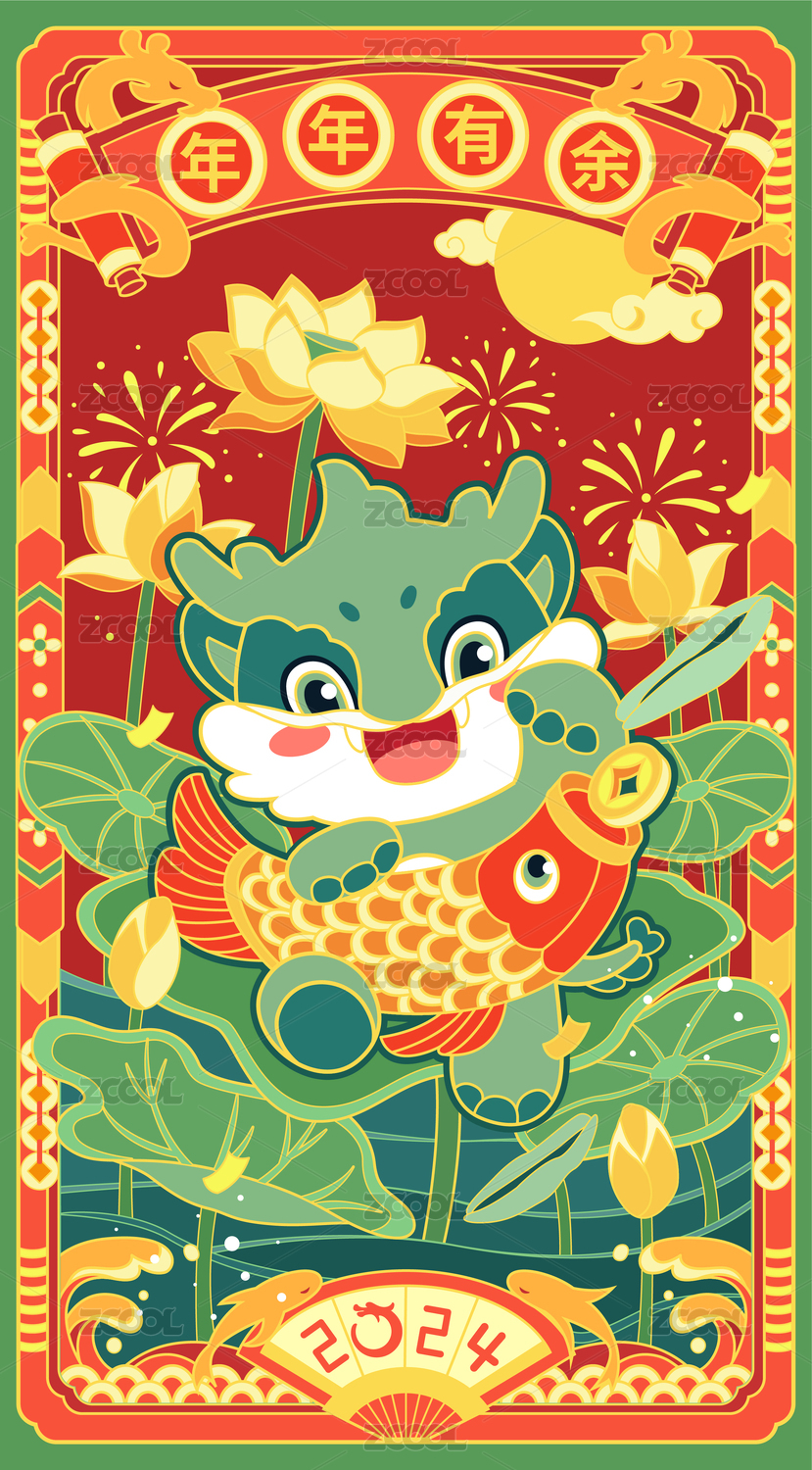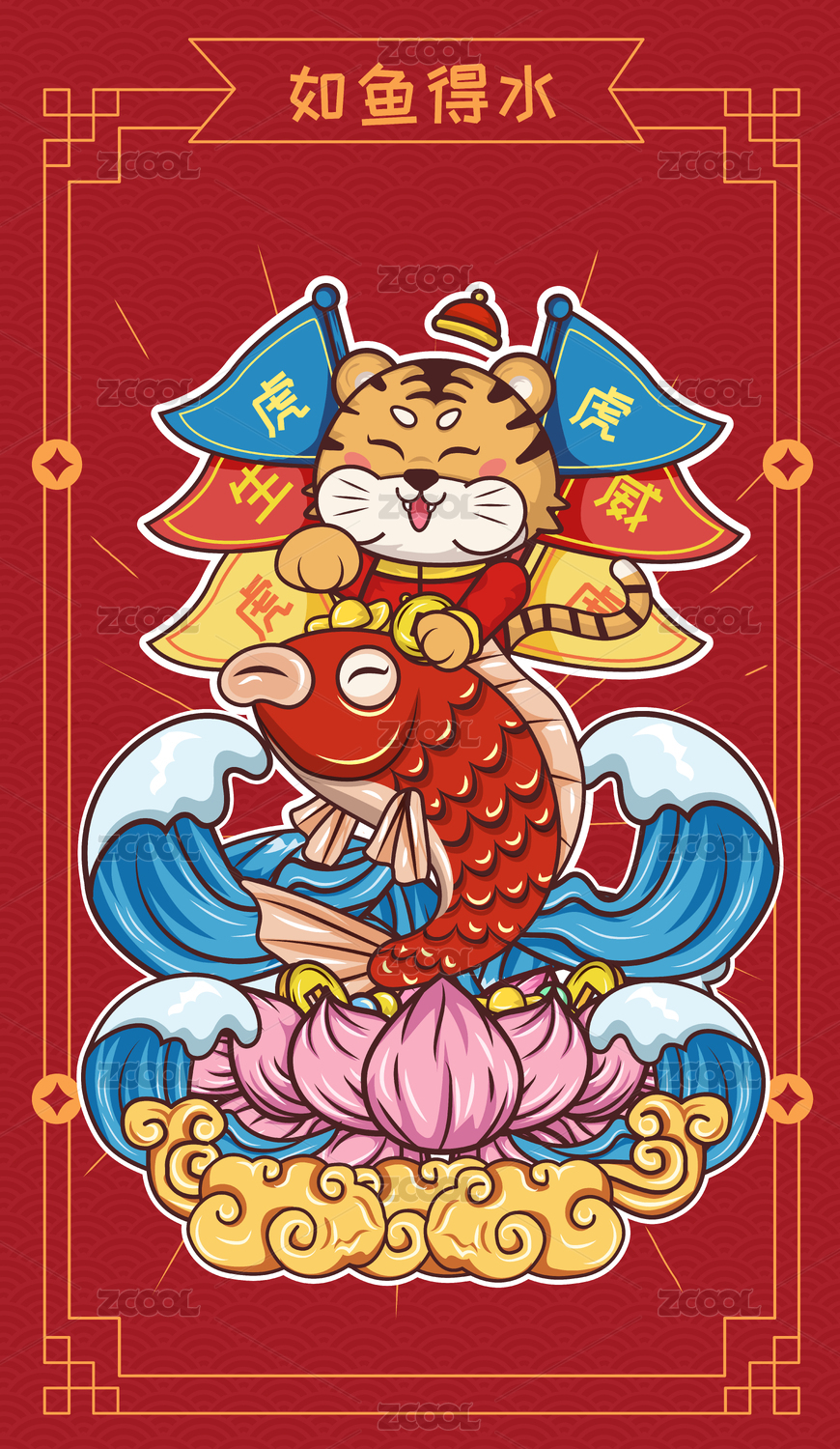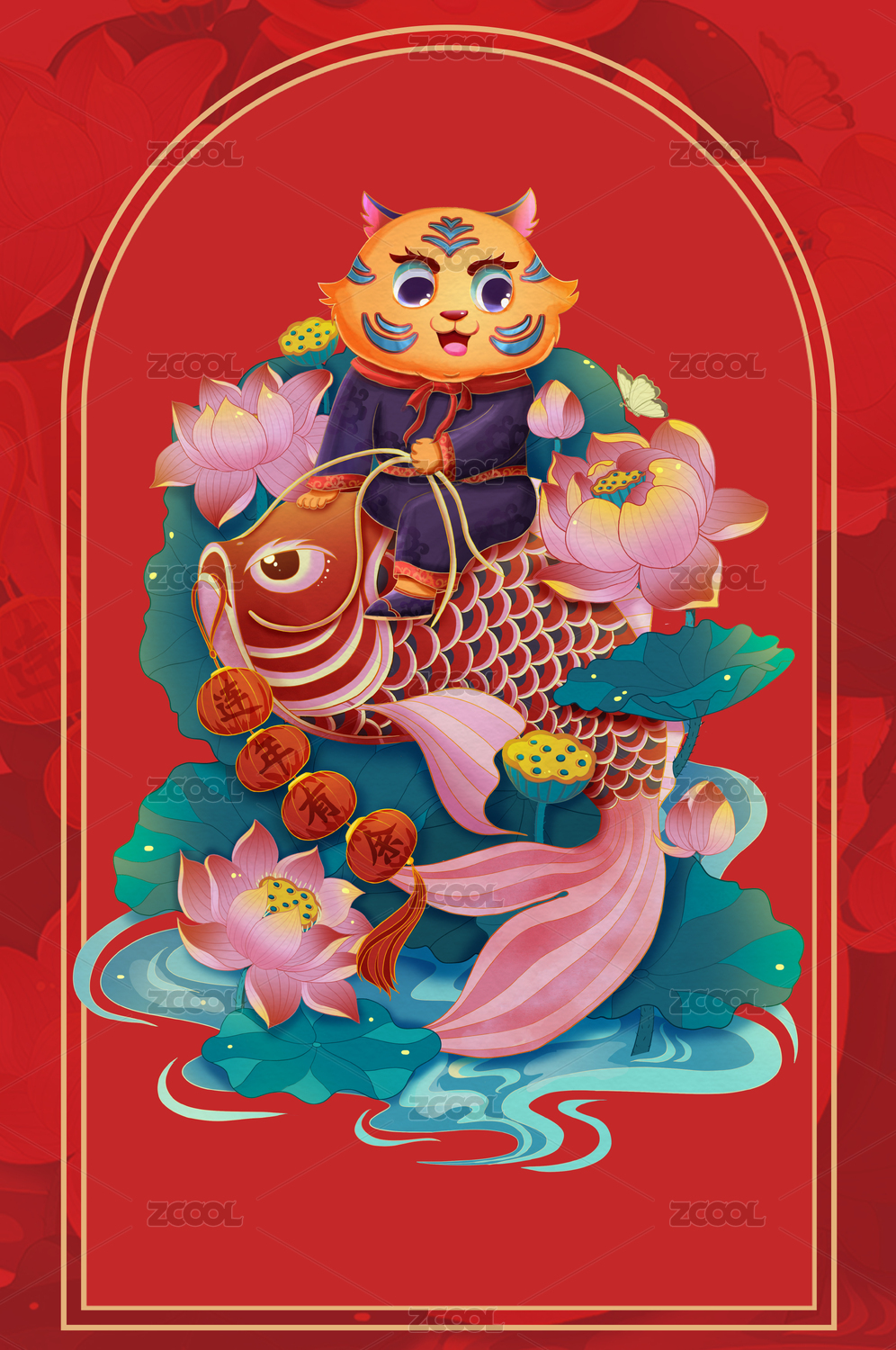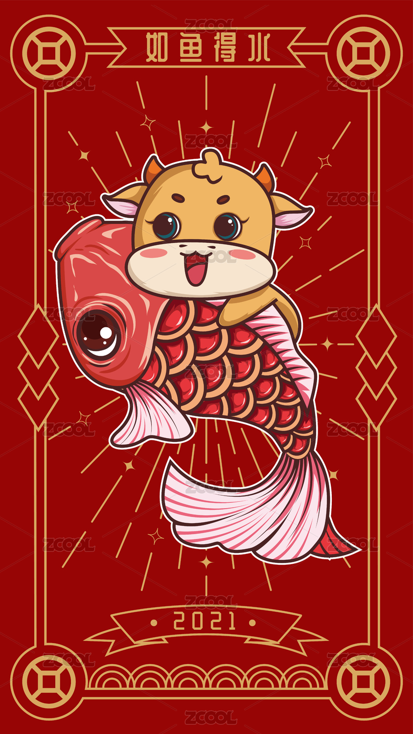 牛年新年国潮插画乘风破浪鱼水海浪元宝荷花