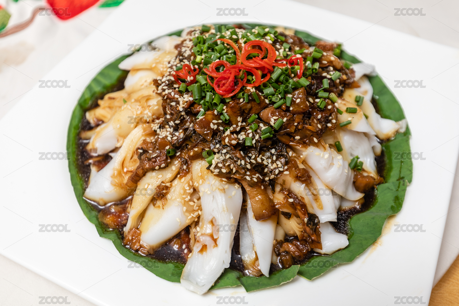 方形瓷盘装的河内肠粉摆放在黑色背景上