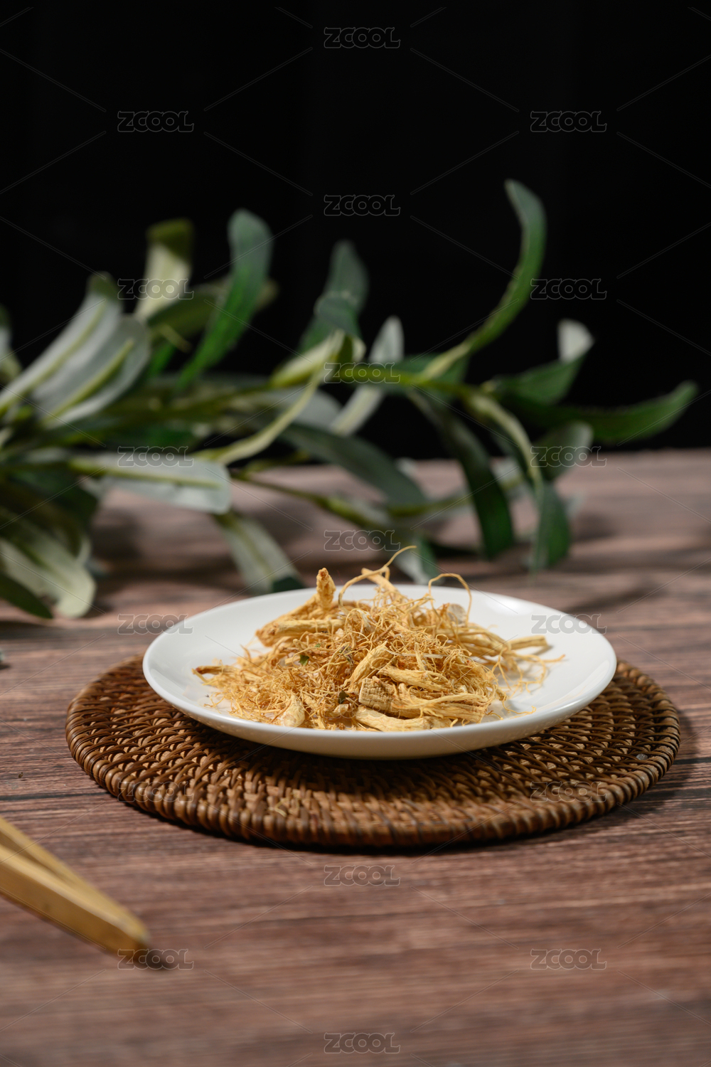 桌面上的盘子里的干爽的人参须